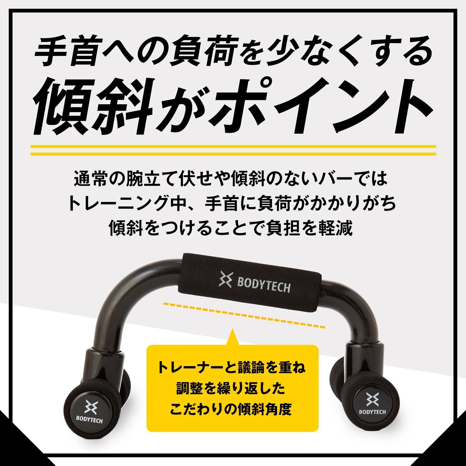 BODYTECHのプッシュアップバーはグリップに傾斜を設けることで手首に掛かる負担を軽減。