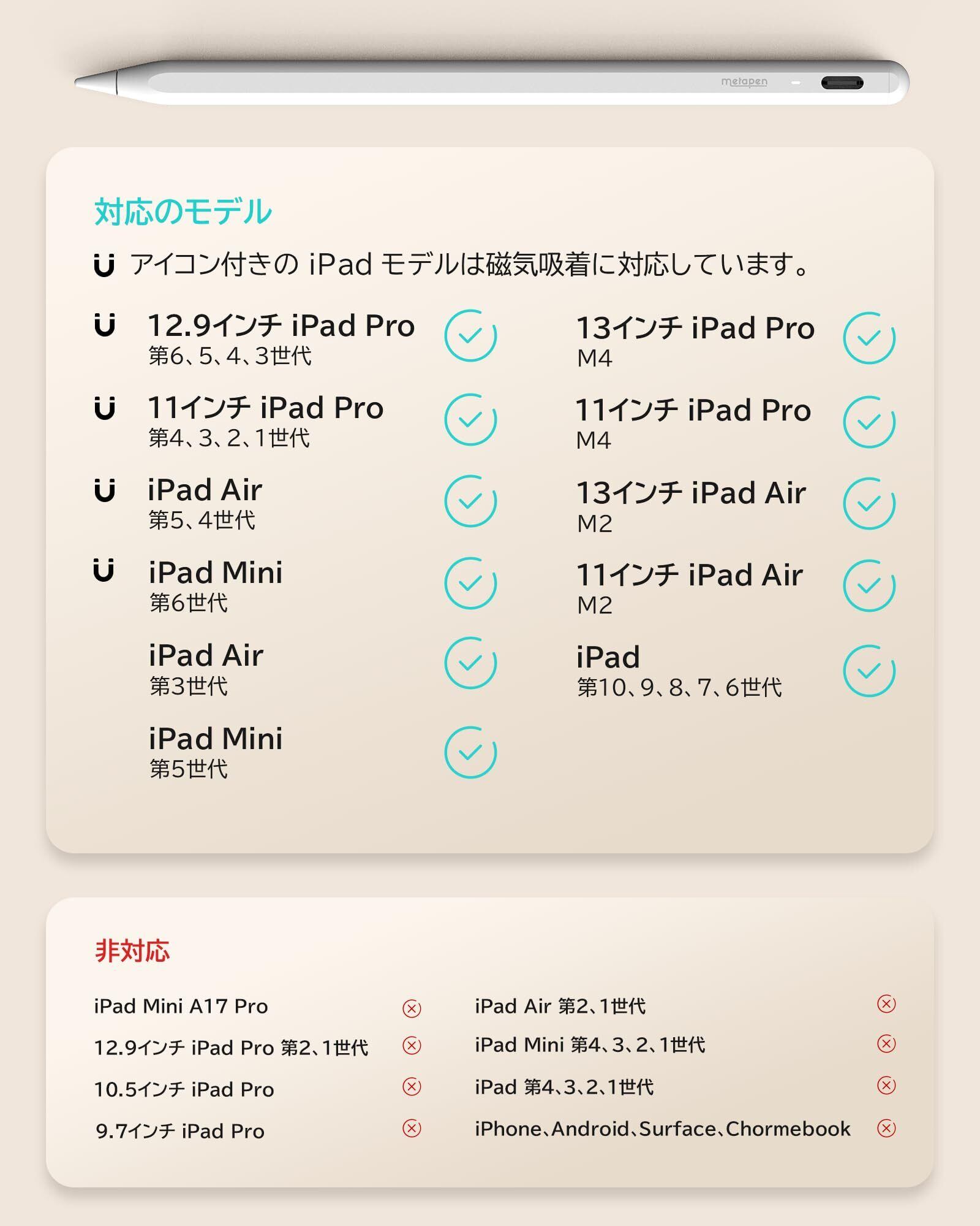 【2018年以降のiPad専用タッチペン(iPad Mini7非対応)】Metapen A8は、2018以降のiPadモデルに最適なコンパニオンです:iPad 第6/7/8/9/10世代、iPad Air 第3/4/5世代、iPad Pro 11インチ第1/2/3/4世代、iPad Pro 12.9インチ 第3/4/5/6世代、iPad Mini第5/6世代、 iPad Pro 13/11 inch(M4)、iPad Air 13/11 inch(M2)。アップルペンシルの最高な選択です。ご注文の前にデバイスを確認してください、他のモデルは無効です。