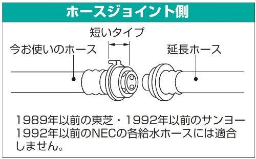 【注意】1989年以前の東芝、1992年以前のサンヨー、1992年のNECの各給水ホースには適合しません。又、洗濯機とは直接接続できません。既存の洗濯水栓や洗濯ニップルに直接接続するため、元口の付属はありません。