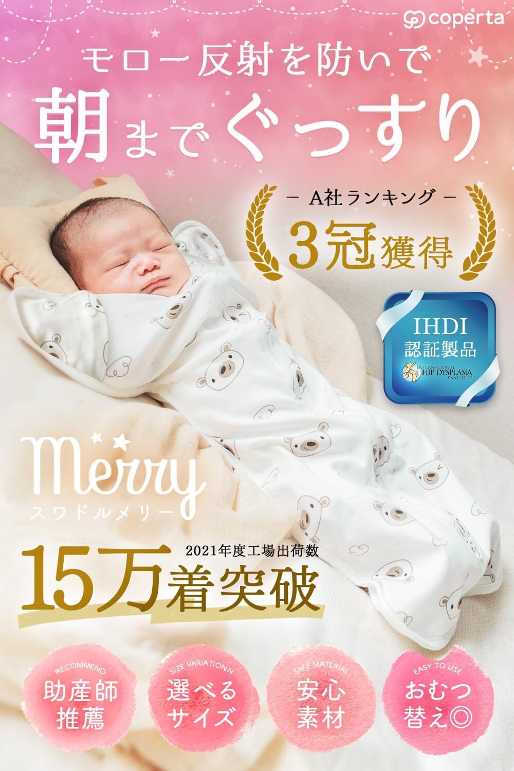 【モロー反射防止】モロー反射とは、新生児に良く起きる正常反射のひとつで、寝ている間に無意識に起きることで睡眠の妨げとなるため、何度も昼夜問わず目を覚ましてしまいます。コペルタのスワドルは優しく包みながらモロー反射を自然に抑制し、赤ちゃんの寝かしつけに大活躍します