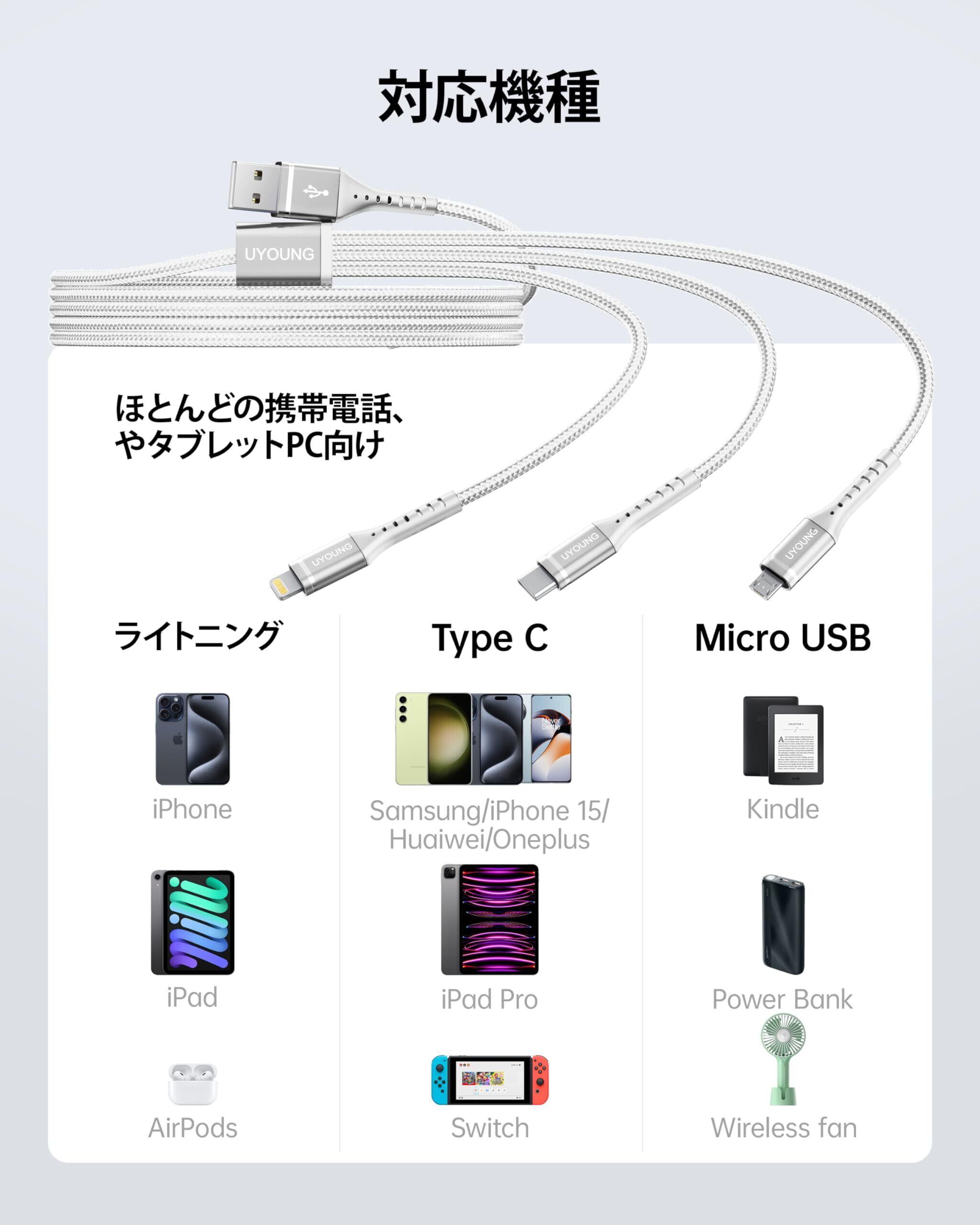 【対応機種・幅広い互換性】3in1 多機能ケーブルはほぼ全設備にphone対応できます。ライトニング端子・Type C端子やMicro USB端子搭載のスマホ・タブレット・イヤホン等のUSB周辺機器を対応します。