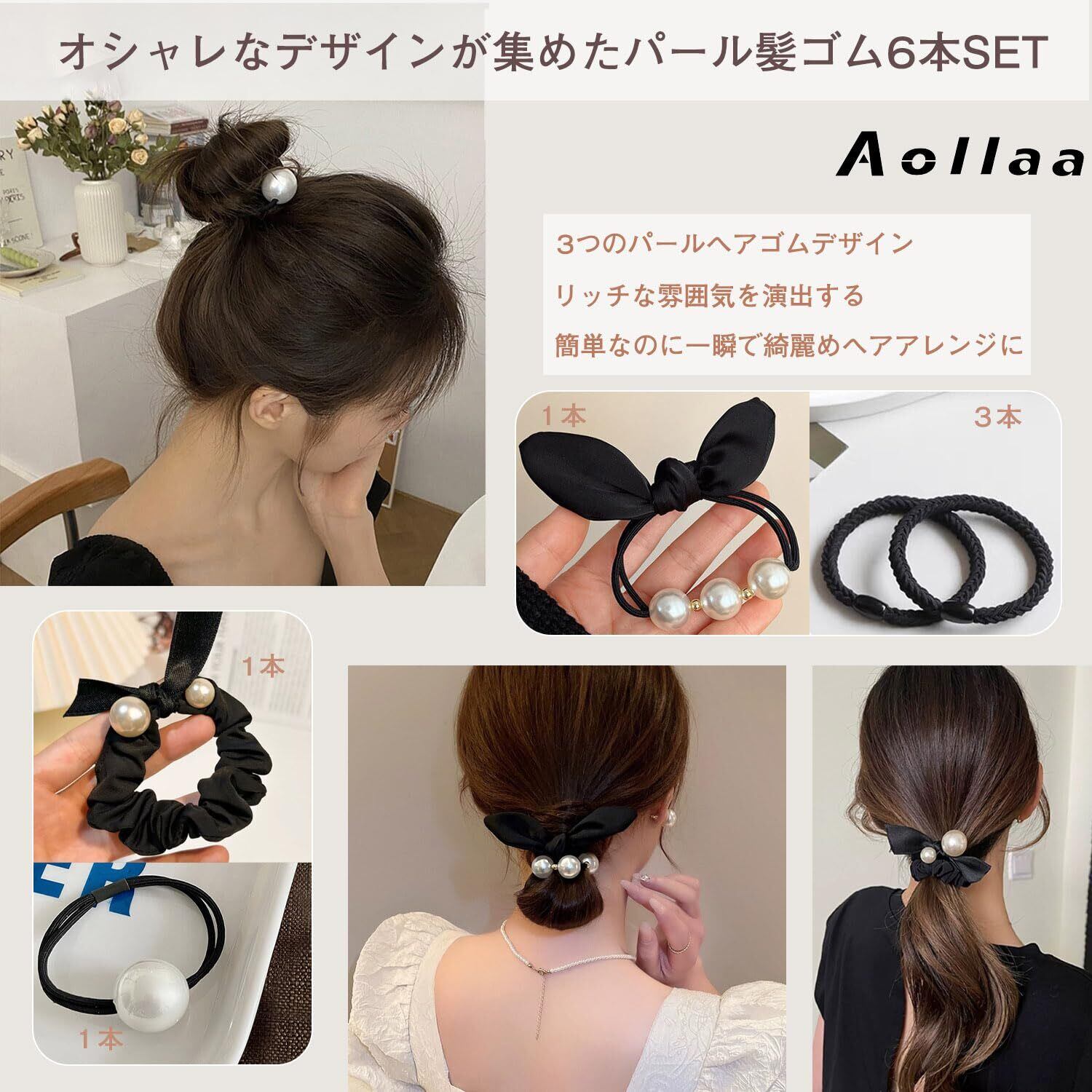 【特価商品】[アオラー]Aollaaヘアゴム 黒 パール髪ゴム 大粒【オシャレ!4種6本Mix】パール子 ヘアシュシュ 可愛いリボンゴム 人気韓国風 おしゃれ大人ヘアアクセサリー 跡がつかない髪留めゴム 黒色 ヘアリングゴム レディース ヘアアレンジ パールゴム髪飾り(4種6本)