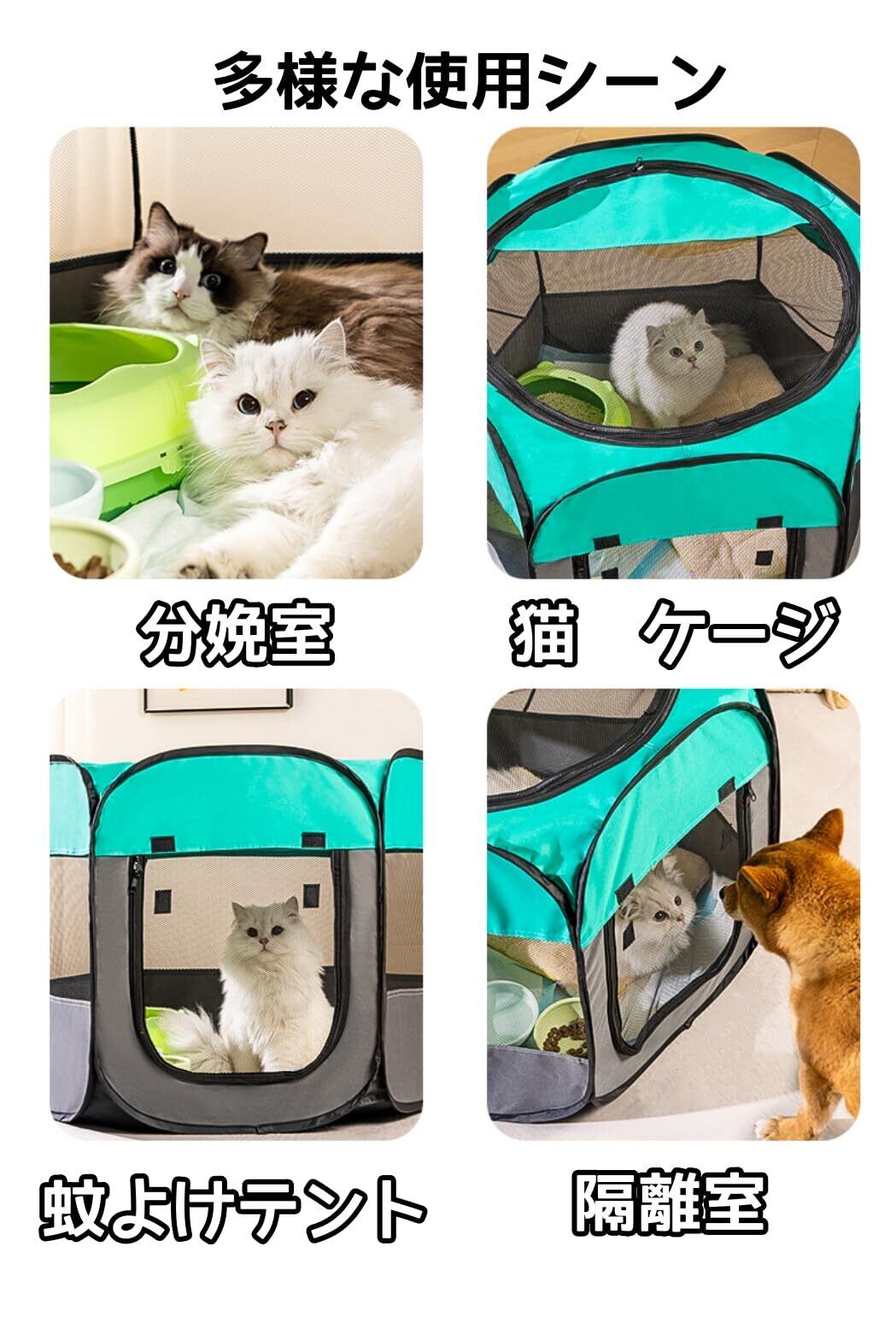 【色んな場所に適用】部屋の広いところに置いてはペットハウスとして使う、室外にペット関連のアウトドアの場合にもペットサークルとして活躍。ペットドライブにも後部席に置いて車載ペットキャリーバッグとして使えます。持ち手が付いてるので、歩いて持ち運べるタイプのペットハウス。