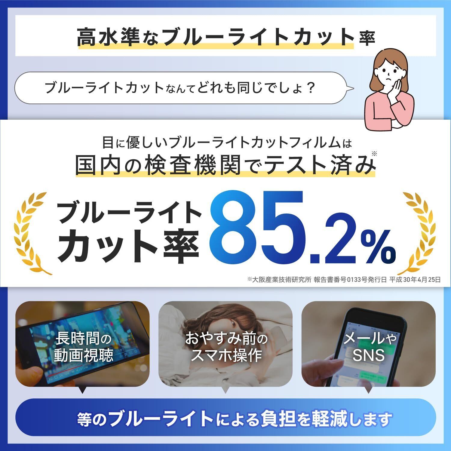 【 目に優しい ブルーライトカット 】 日本製強化ガラス(旭硝子)を使用した硬度10Hのガラスフィルムにブルーライトカット機能を追加し、UV紫外線(200-380nm)を98%カット。ブルーライト危険域(特に紫外線に一番近い380-410nm)は85.2%としっかりカット。ブルーライト域全体(380-500nm)でも26.4%カットします。