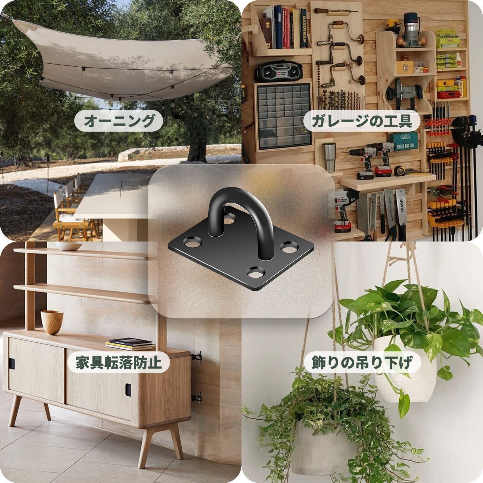 様々なシーンで活躍:壁や天井の吊りフックとして、例えば、オーニングの吊り下げ、家具転倒防止など、屋内外設置場所を問わずご利用できます。