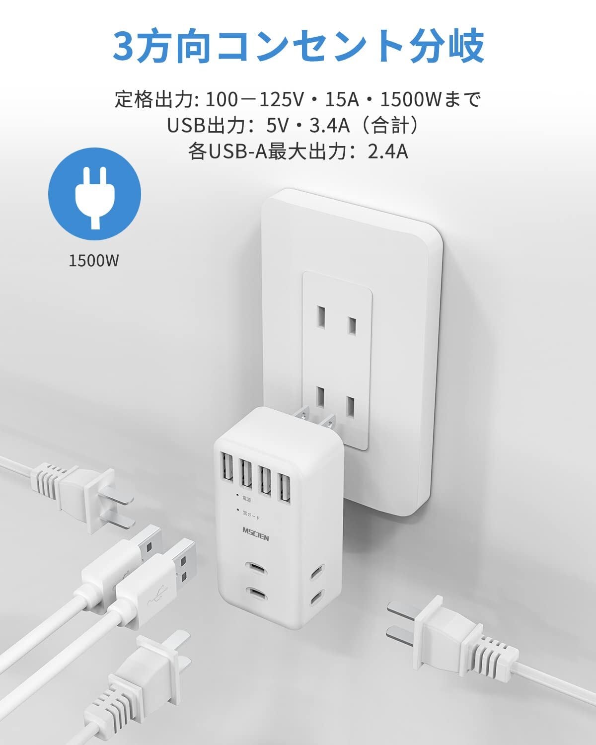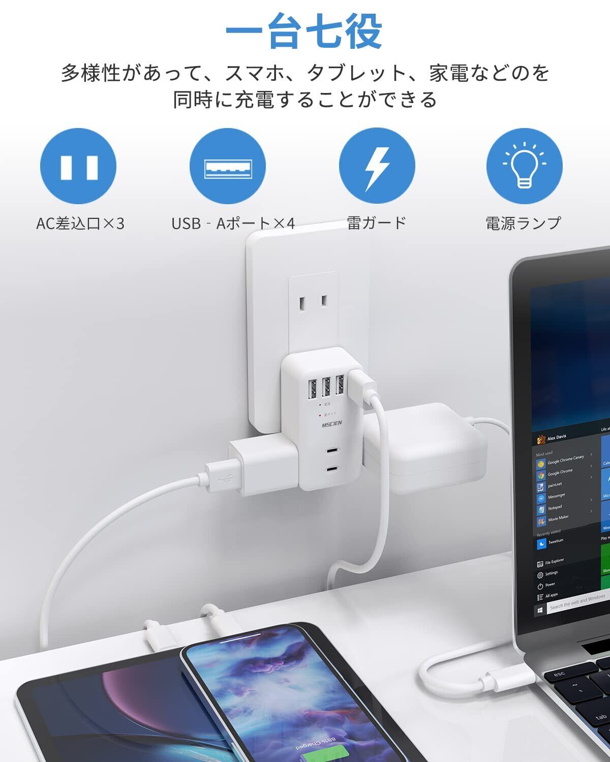 「1台7役・コンセントタップ」4つのUSB-Aポートと3つのAC差込口を搭載したマルチタップです。また、ACコンセントを3方向に分配して、小型ACアダプタを同時に挿入しても干渉せず、配線がすっきりしています。