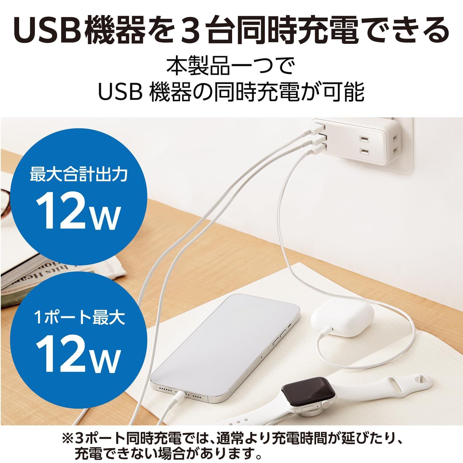 【人気商品】エレコム 電源タップ USBタップ 2.4A (USBポート×3 コンセント×2) 直挿し ホワイト ECT-03WH