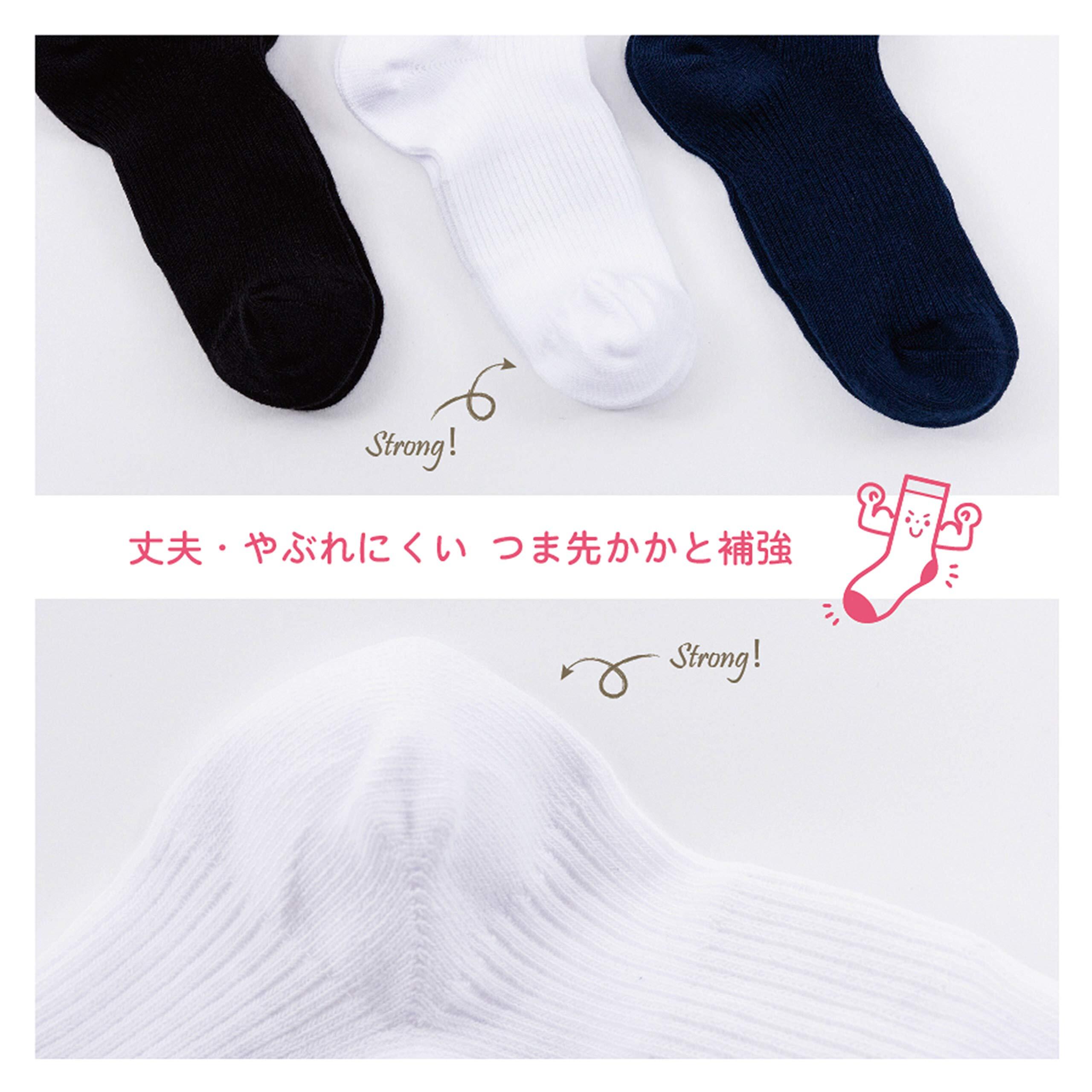 定番の無地リブソックス。 通学はもちろん、普段使いもしやすいシンプルなデザイン。つま先・カカト補強で破れにくく、ゴムサポート設計でズレ落ちにくい仕様です。短いタイプの丈なので 春 夏にもピッタリです。