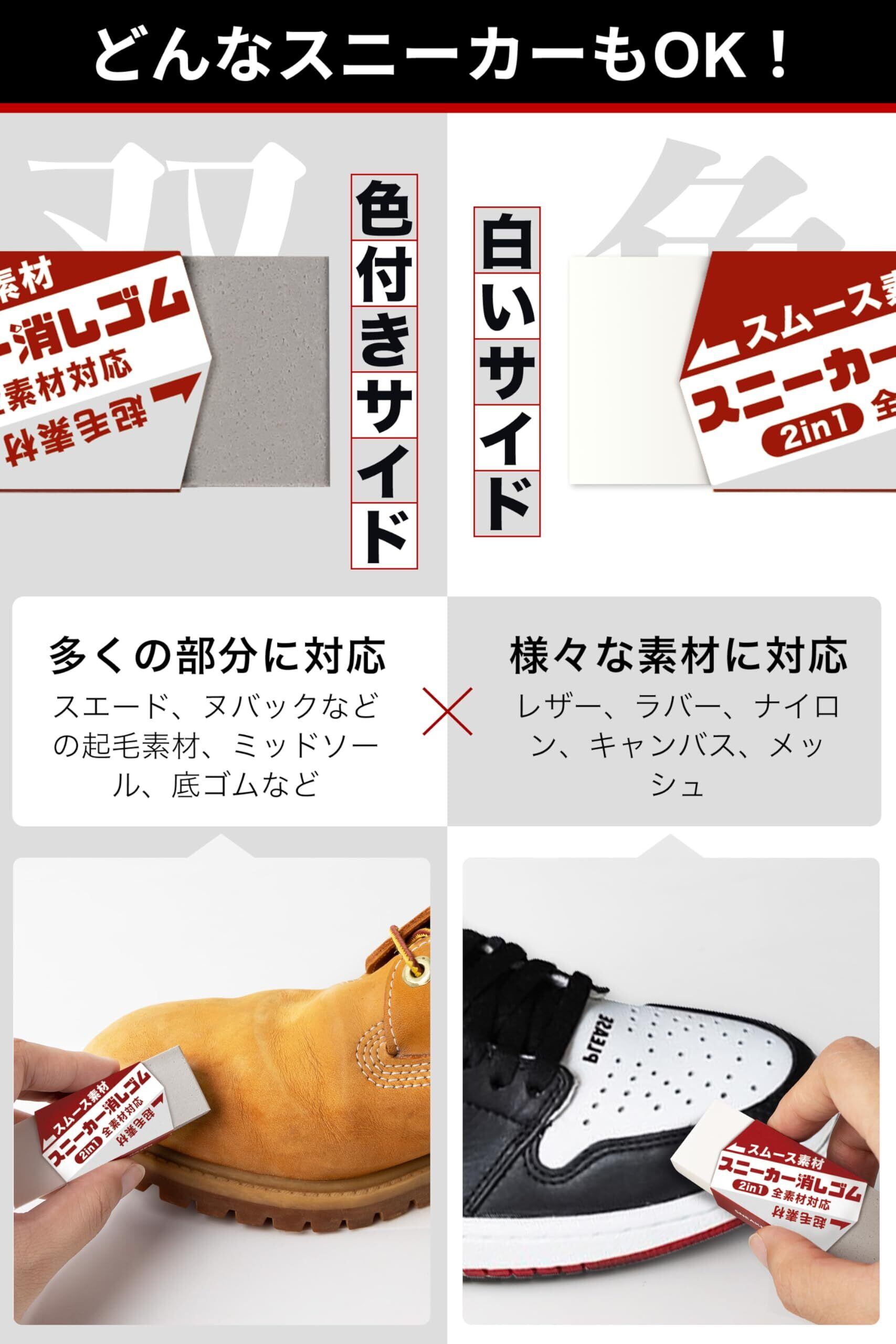 【汚れだけを落とす・スニーカーをキレイに】スニーカー専用の消しゴムを使うと、汚れだけを効果的に吸着し、すぐにキレイにします。靴に優しく、常に美しい状態を保つことができます。汚れを落とすには適度な摩擦が必要ですが、消しゴムタイプのため、削りカスがかなり出ることがあります。※長期間放置した汚れや経年劣化による黄ばみなどは落とせません
