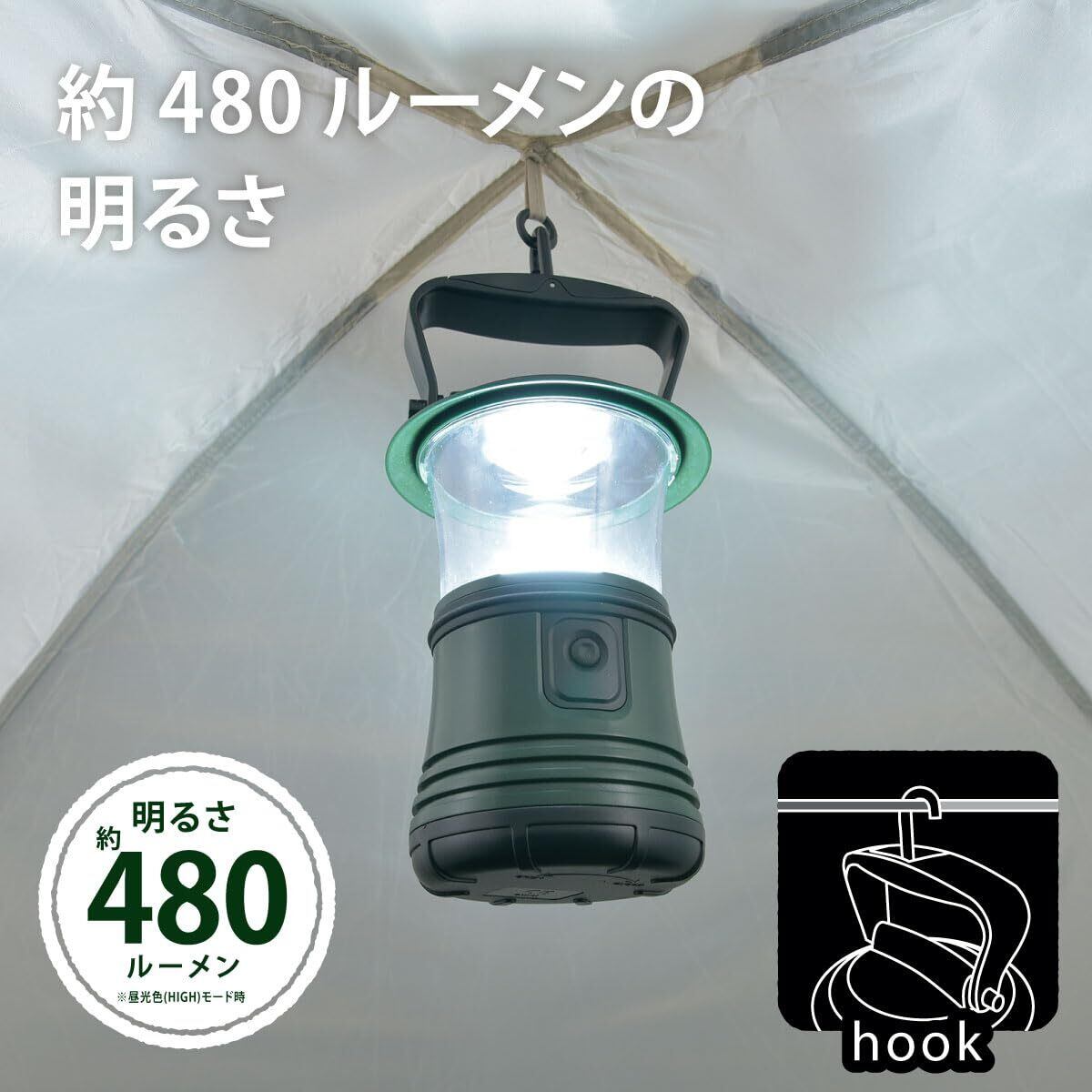 【 仕 様 】 ◆電源:単1形乾電池×3本(別売) ◆光源:白色系LED5個、暖色系LED1個(LED交換不可) ◆光束:・ 昼光色(HIGH)モード…約480 lm、昼光色(LOW)モード…約180 lm・ 電球色(HIGH)モード…約24 lm、電球色(LOW)モード…約7 lm