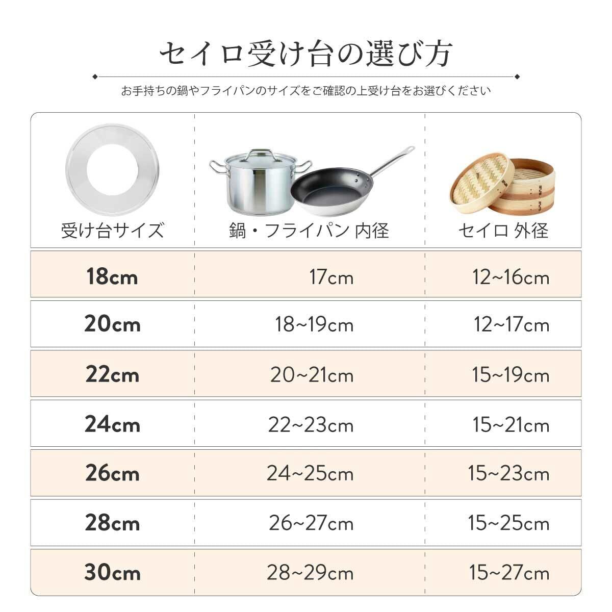 【せいろと鍋の対応サイズ】直径15~25cmのせいろ、直径26~27cmの鍋に対応しています。事前にお手持ちのせいろと鍋のサイズをご確認ください。