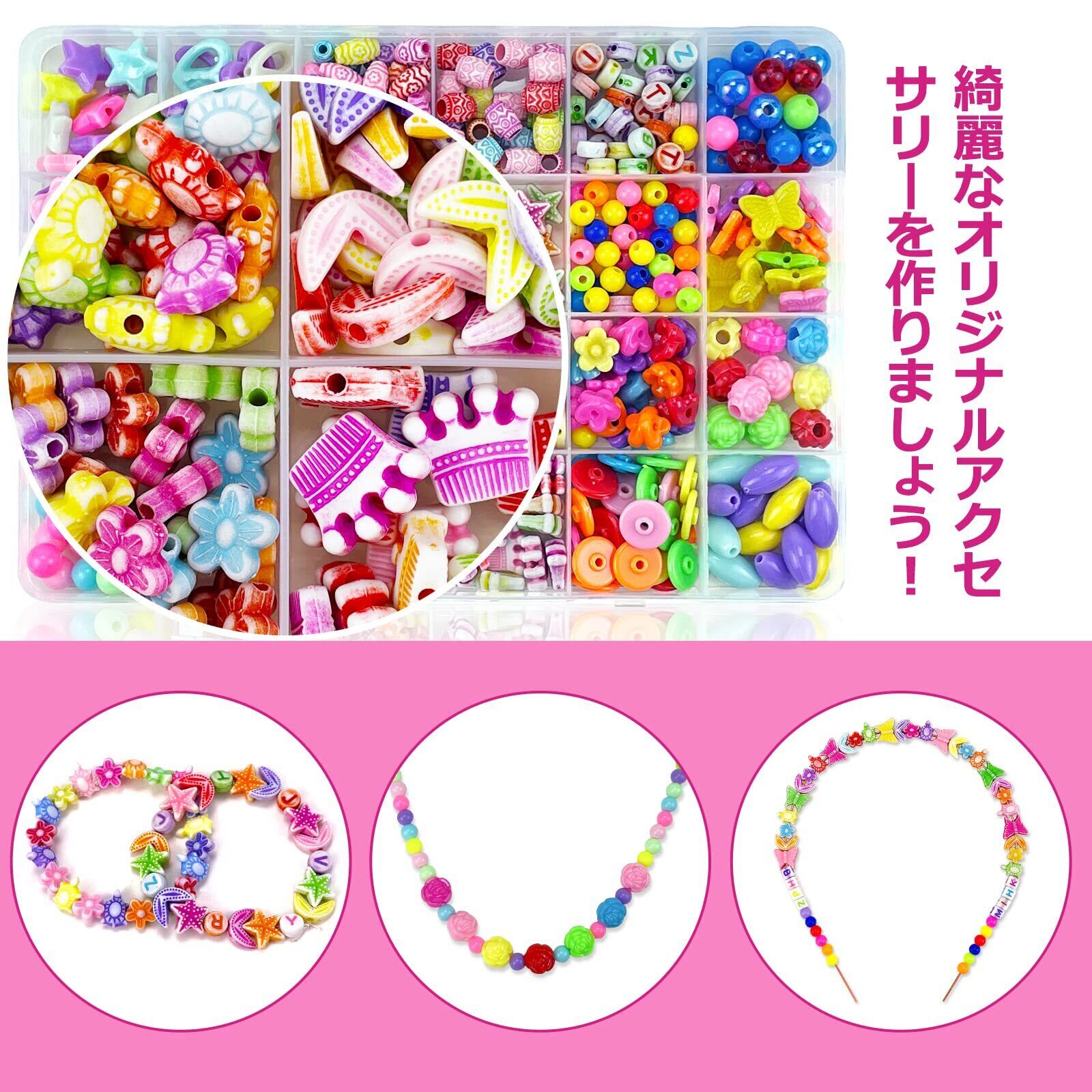 ビーズ おもちゃ 女の子 手芸 DIY アクセサリー 手作りキット ブレスレット ネックレス 紐通しカラフル カチューシャ 約450個 24種類 収納ケース付き ギフト 記念日 クリスマス 誕生日 プレゼント