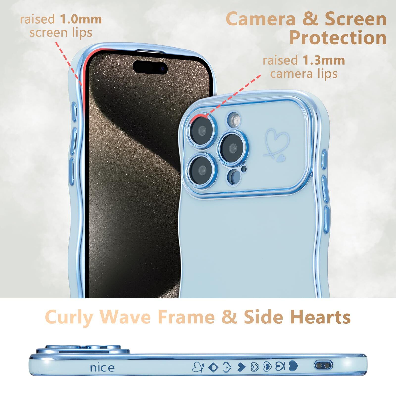 iPhone 15 Pro Max 用 ハートケース 人気 おしゃれ iPhone 15 Pro Max 波型ケース 柔軟な TPU シリコン ウェーブ デザイン スマホケース メッキ加工 ソフト 軽量 耐衝撃 韓国 可愛い アイフォン 15 Pro Max ケース 女子 女性 携帯電話カバー ワイヤレス充電対応 (シエラブルー)