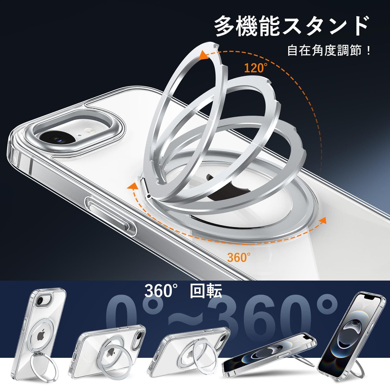 iPhone 16e 用 ケース Magsafe対応 アイフォン16e カバー 360°回転スタンド Uovon スマホケース アイホン16e 携帯ケース ワイヤレス充電 車載ホルダー 対応 ストラップ穴付き 透明 指紋防止 黄变防止 ・ クリア