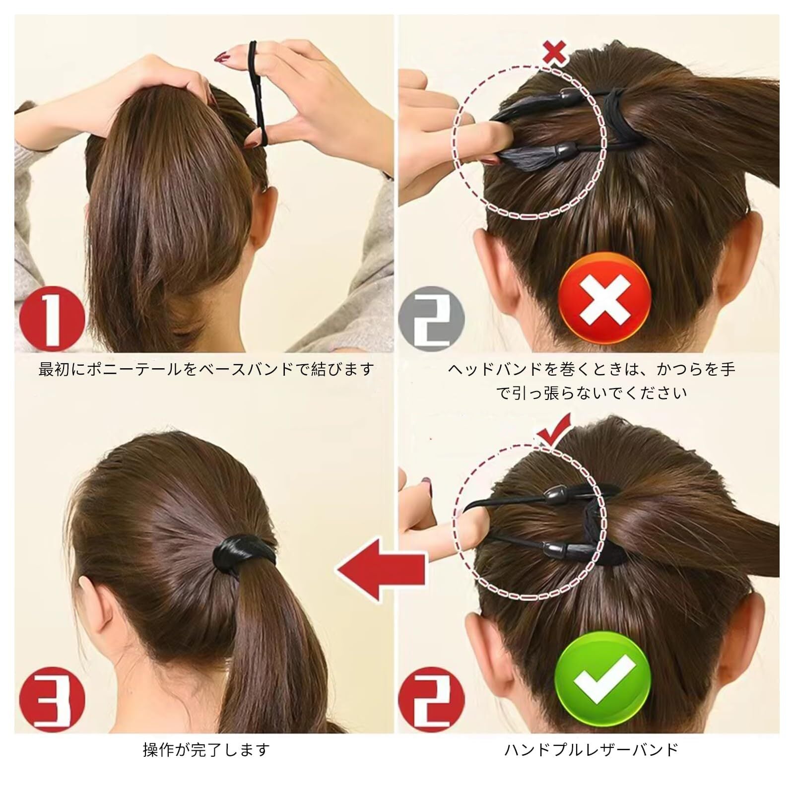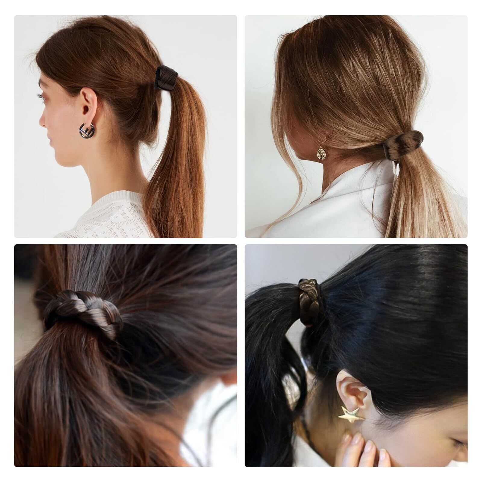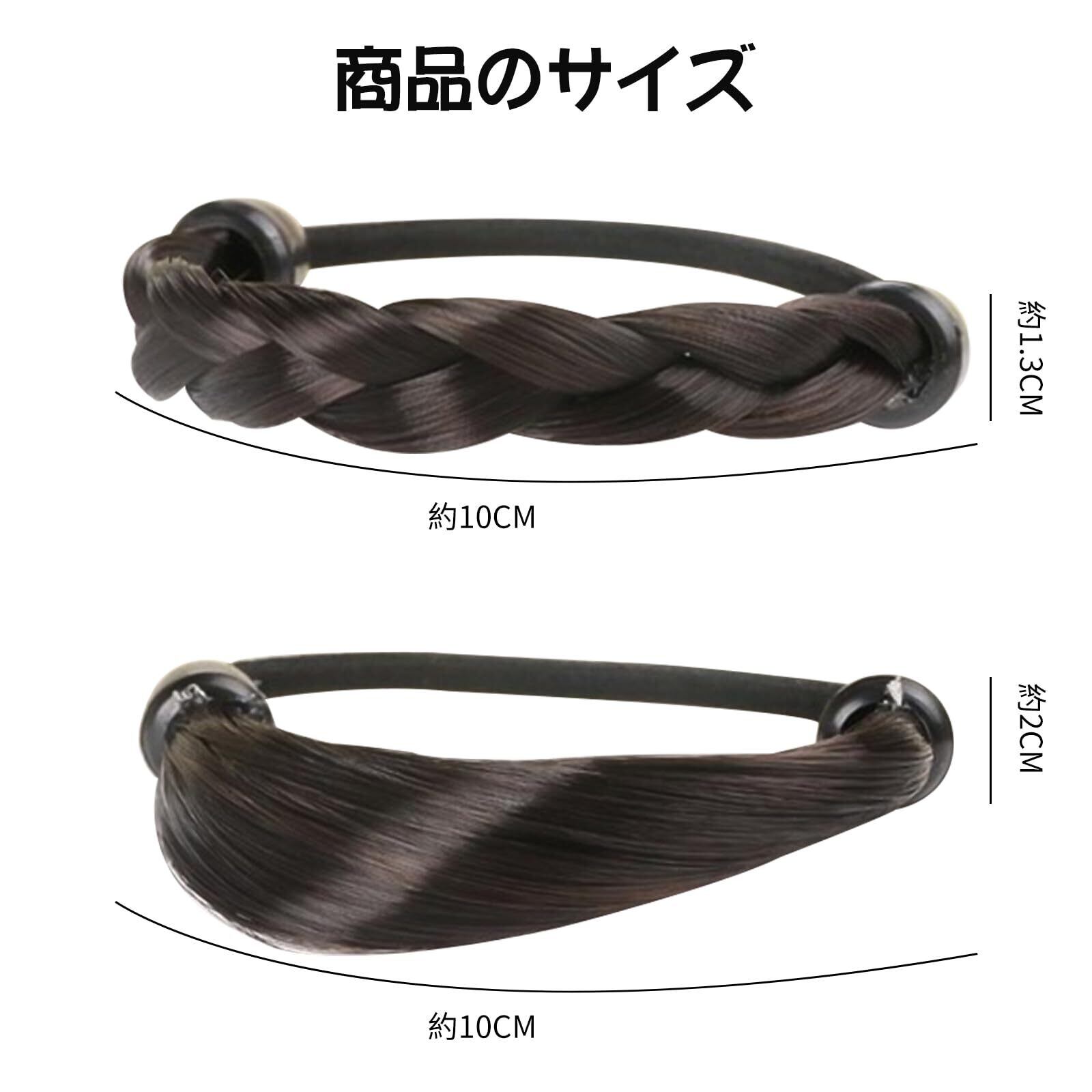 【ナチュラルなスタイル髪ゴム】半分のヘアゴムは自然なウィッグに使われる毛でできるので、自分の髪をぐるっと巻き付けたように結び目部分を隠すことができる。髪の毛をぐるっと巻きつけたようなナチュラルなヘアスタイル。また光沢感があり、地毛と色がマッチしていて自然な感じに見える。