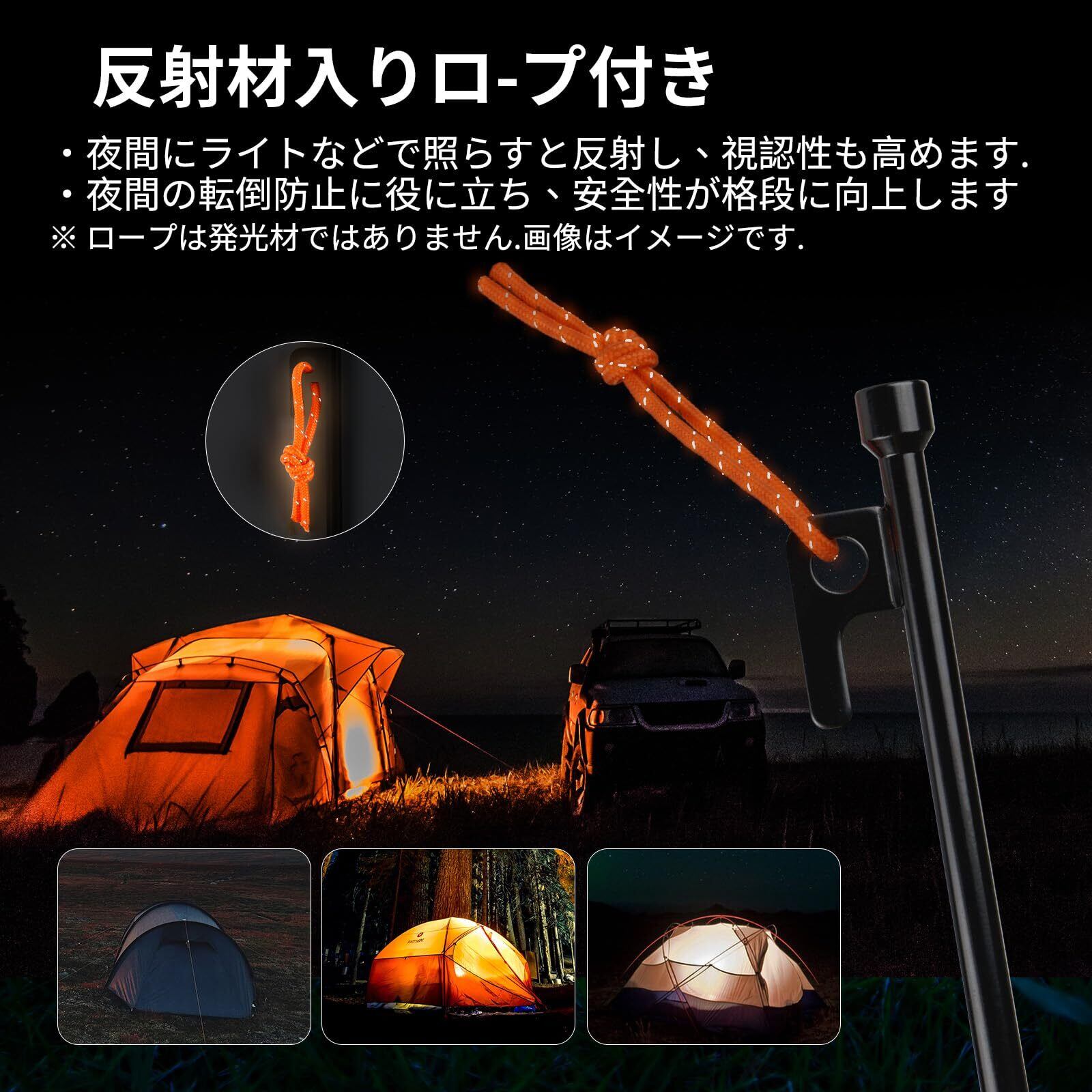 【反射材テントロープ付き】:蛍光色ロープに反射材を編みこんだリフレクティブロープつけて、真っ暗なところでぼんやり光り、光が当たればキラキラする反射材入り、 キャンプ中の事故防止に!ペグ回収が簡単になります。(ヒント:照明がない限り、ロープは反射しません。)