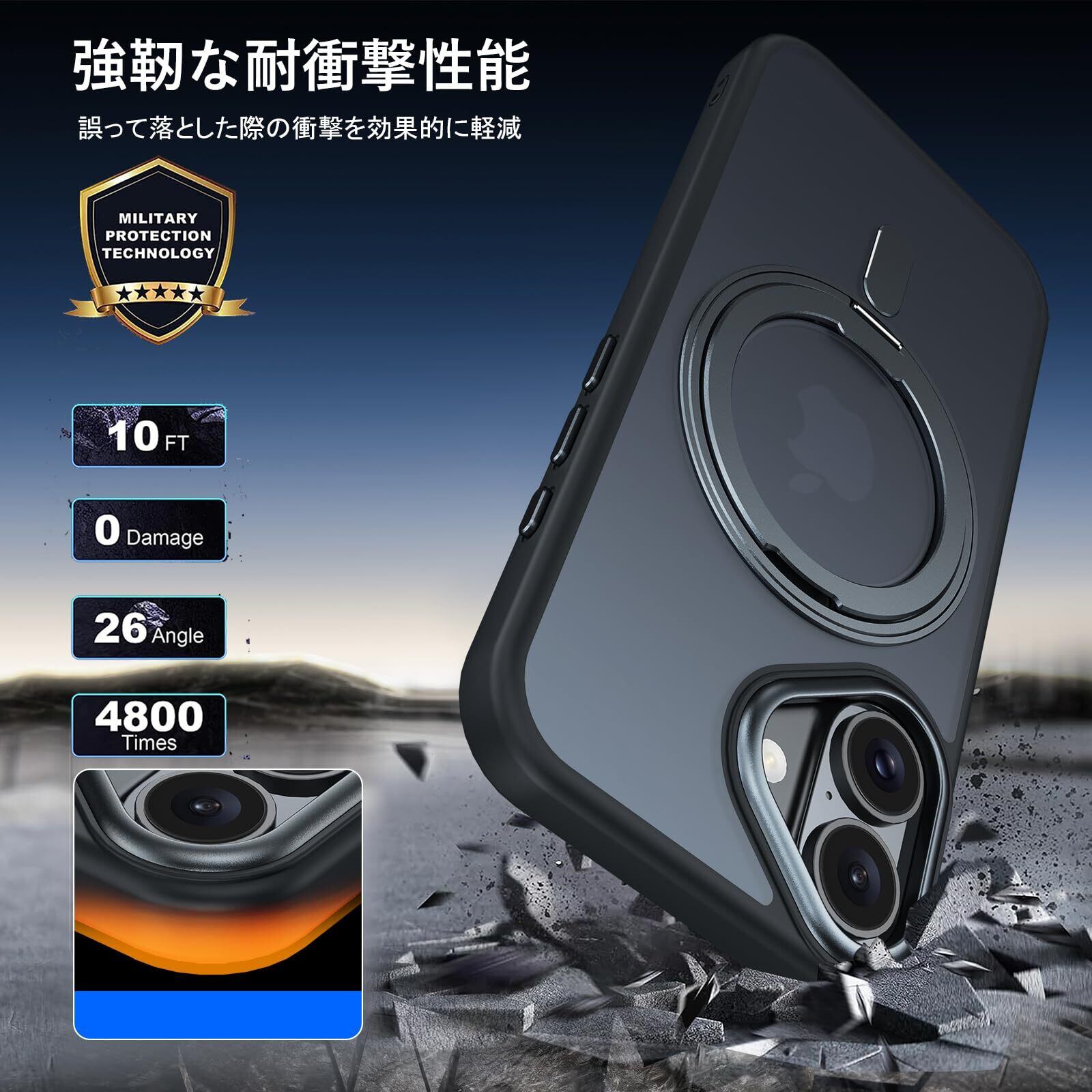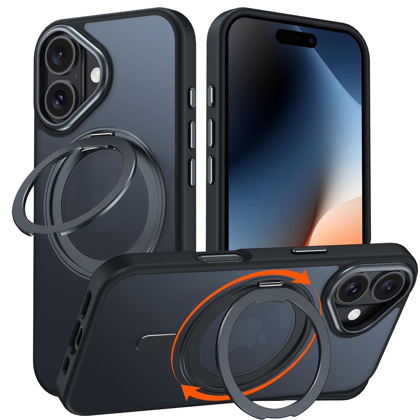 iPhone 16 適用 ケース Magsafe対応 アイフォン16 カバー 360°回転スタンド Uovon スマホケース アイホン16 携帯ケース ワイヤレス充電 車載ホルダー 対応 ストラップ穴付き 半透明 指紋防止 黄变防止 ・ ブラック