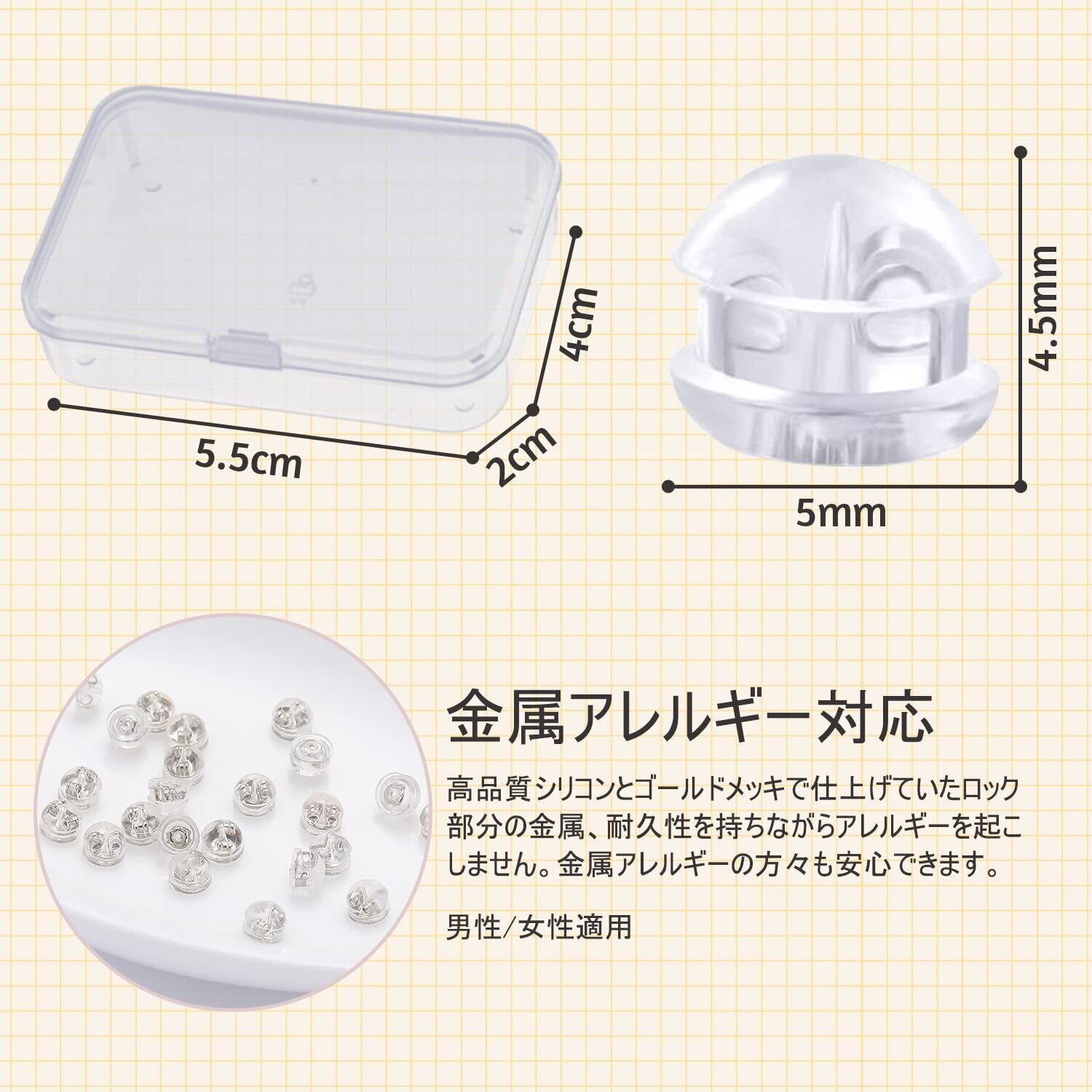 「金属アレルギー対応」高品質シリコンより作られたピアスキャッチの本体に驚くほどの透明感が出ます。ロック部分の金属もゴールドメッキで仕上げており、耐久性を持ちながらアレルギーを起こしません。金属アレルギーの方々も安心できます。