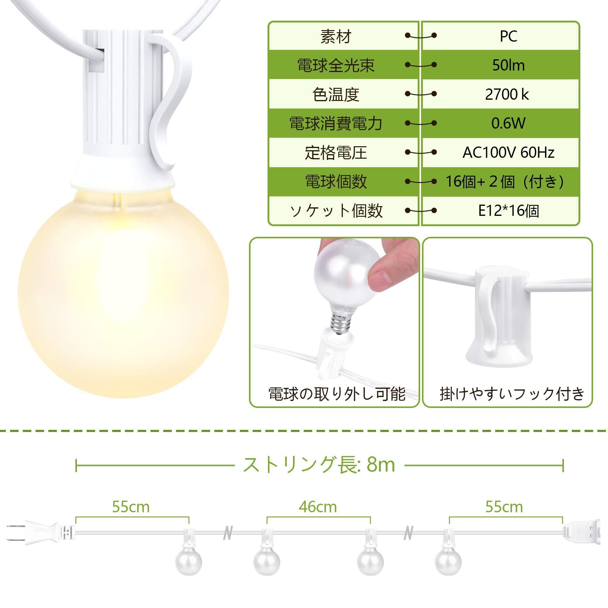 『商品仕様』ストリング長:8m、材質:PC、電球消費電力:0.6w 省エネ97%、定格電圧:AC100V 50/60Hz、色温度:2700k 電球色、口金サイズ:E12、LED電球数:16個+2個(付き)、ソケット個数:16個、防水等級:IP44