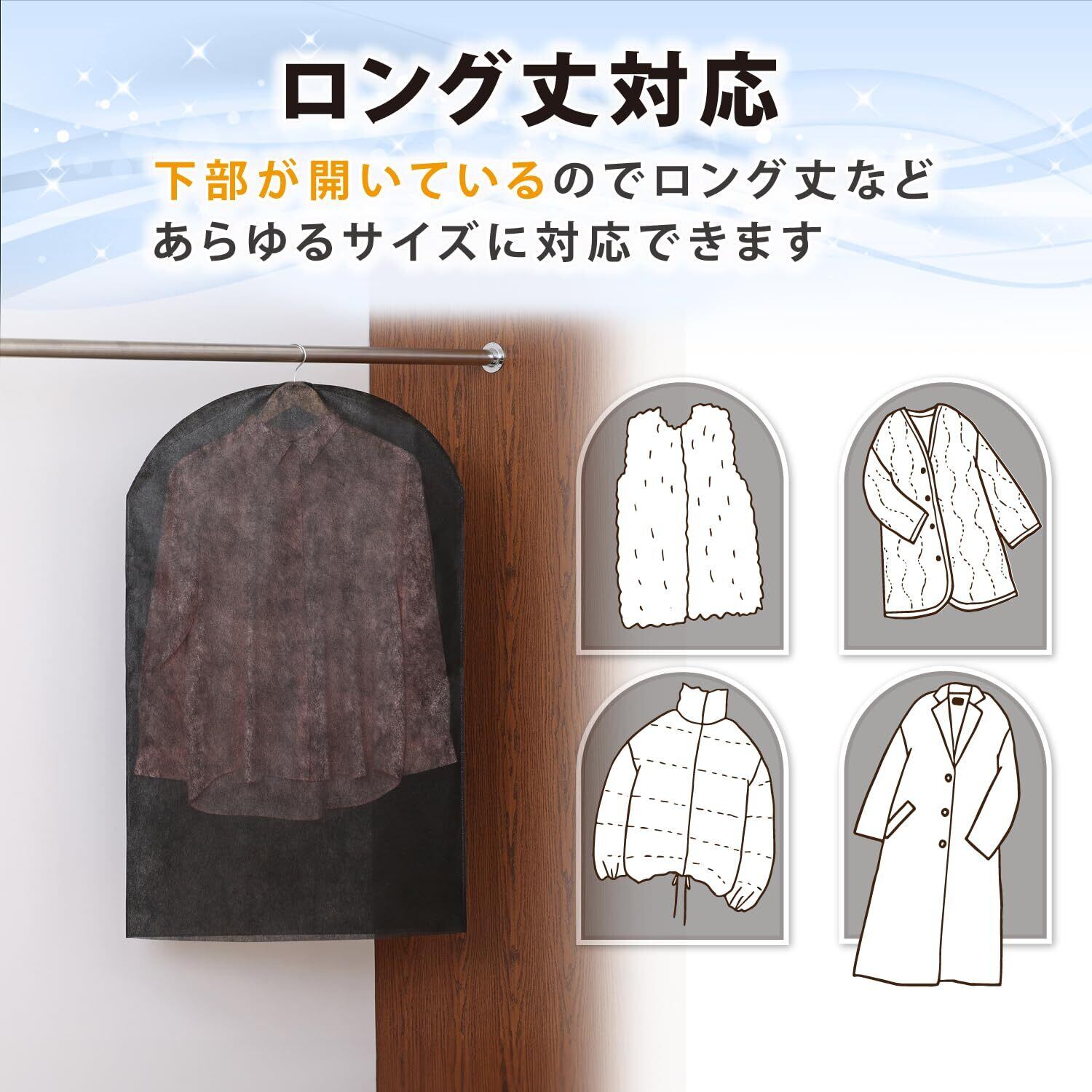 【下部開き・クリーニング後の衣類の保管にも】:下部が開いているのでワンピースやコートなどのロング丈にも対応。クリーニング後の衣類のカバーにも。