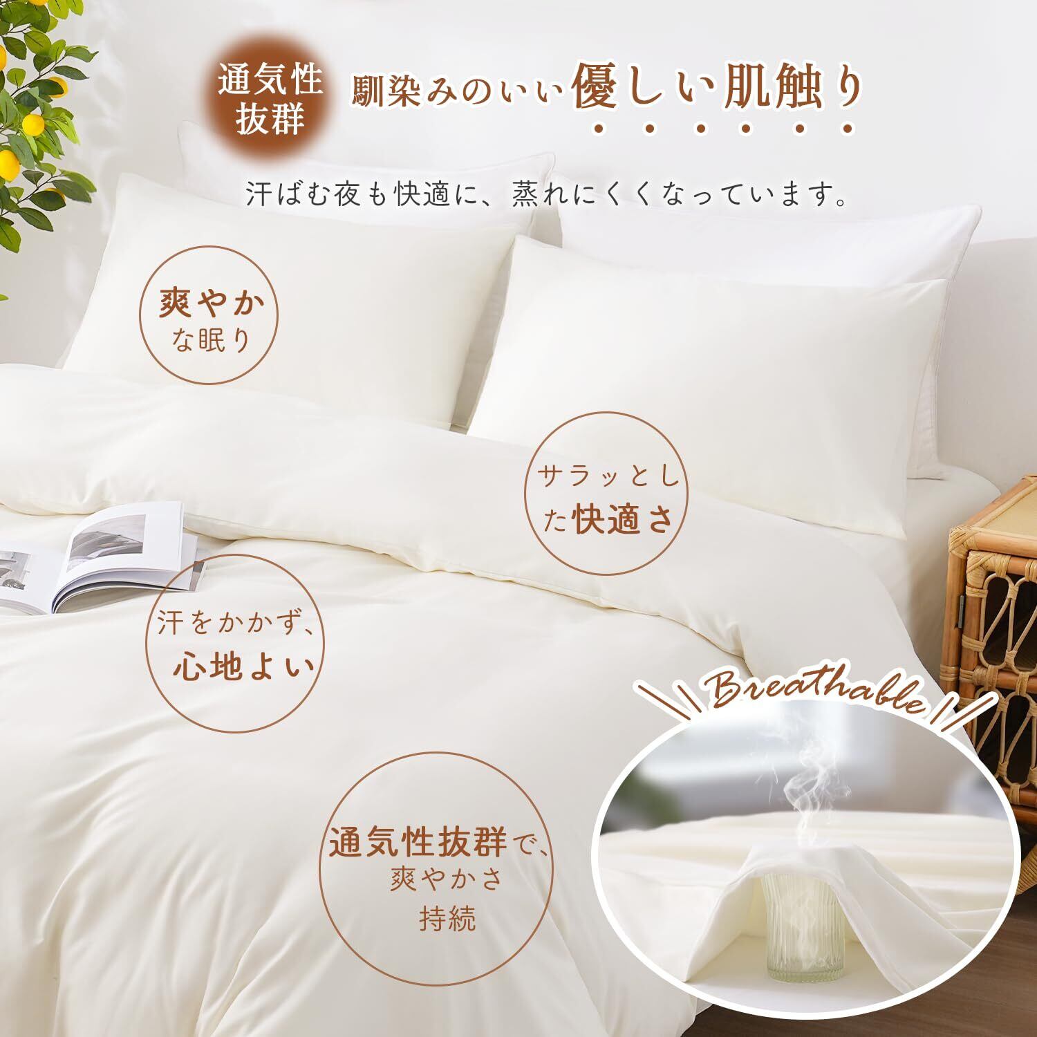【通気性抜群&蒸れにくい快適設計】枕カバーは直接肌に触れるものだから、通気性の良さが重要。吸湿速乾性に優れた生地を採用し、汗や湿気を素早く吸収・発散。寝汗をかきやすい季節でもさらっと快適に過ごせます。オールシーズン対応で、一年中気持ちの良い寝心地を提供します。