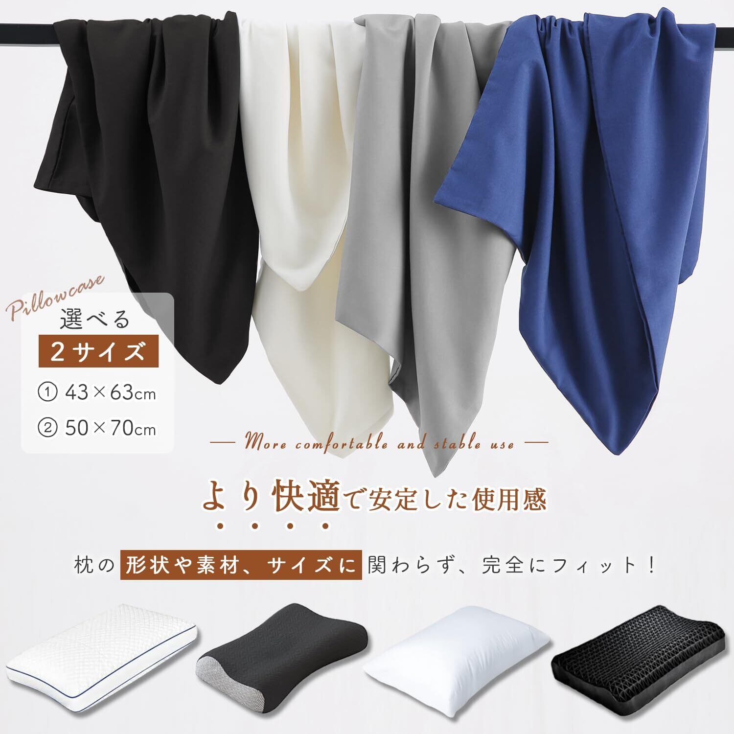 【ストレスフリーの封筒式デザイン&高耐久】ファスナーやボタンを使わない封筒式デザインを採用。寝返りを打っても肌に違和感なく快適に眠れます。さらに、枕をしっかり包み込む仕様なので、ズレにくく、取り替えもスムーズです。丈夫な縫製で毛玉やほつれができにくく、毎日使っても長持ちする高耐久仕様。