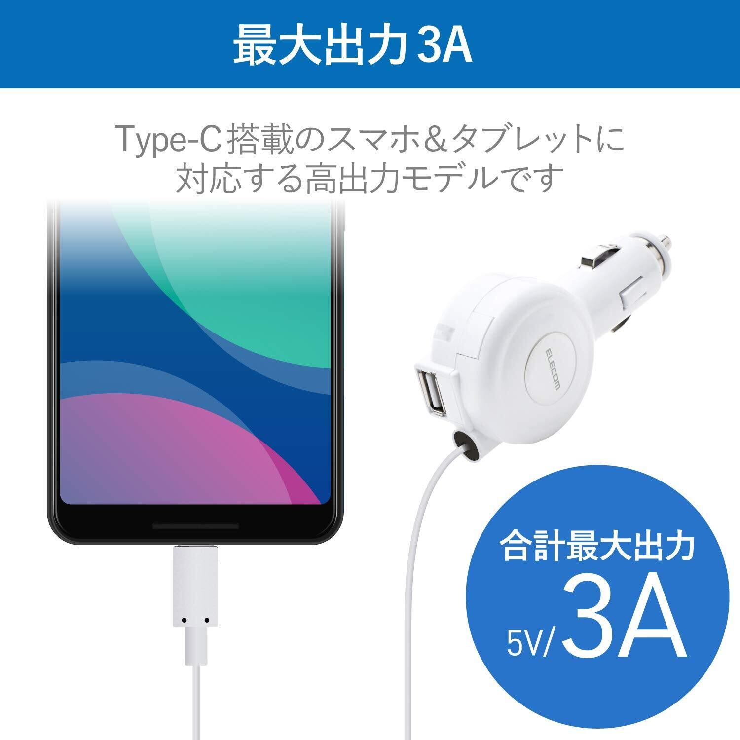 エレコム(ELECOM) シガーチャージャー Type-C リールタイプ USBポート付 ホワイト