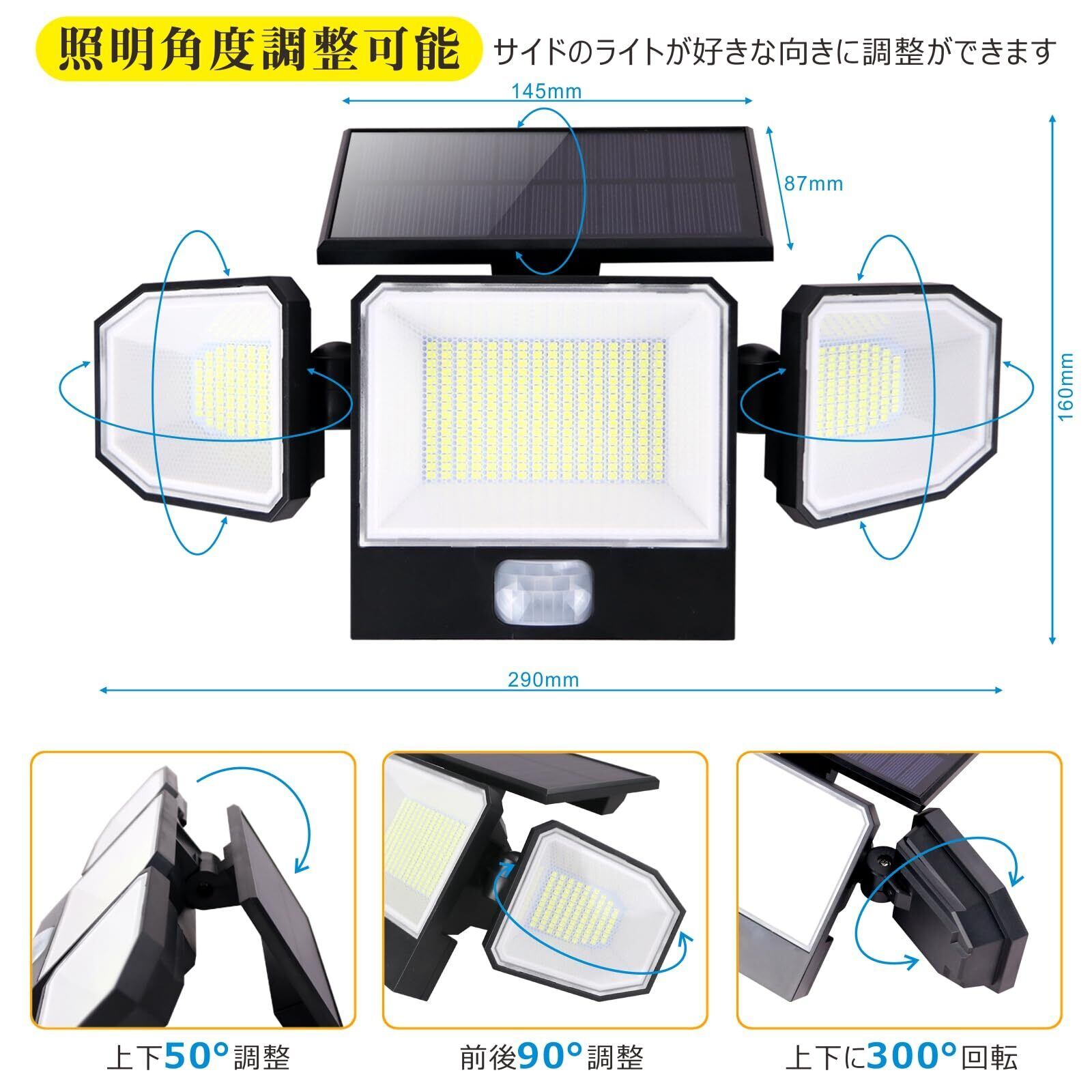 【新発売高輝度440LED&照明角度調整可能】従来のソーラーライトを基础として、ソーラーパネル、LEDチップ、バッテリー、光電変換率、明るさ、外観など全面的なアップグレードを行った。440個高輝度2835型LEDライト、高通過率ランプシェードを採用し、光源均一、昼光色6500K、光束3000ルーメン、照明性能ばっちり!ソーラーパネルと両側のライトを独立に回すことができるので、角度の調節がしやすい、ソーラーパネルを上下50°調整し、サイドのライトを前後90°調整し、上下に300°回転できます。サイドのライトが好きな向きに調整ができて照明角度が300°ほどに達し、照明の範囲も広く。