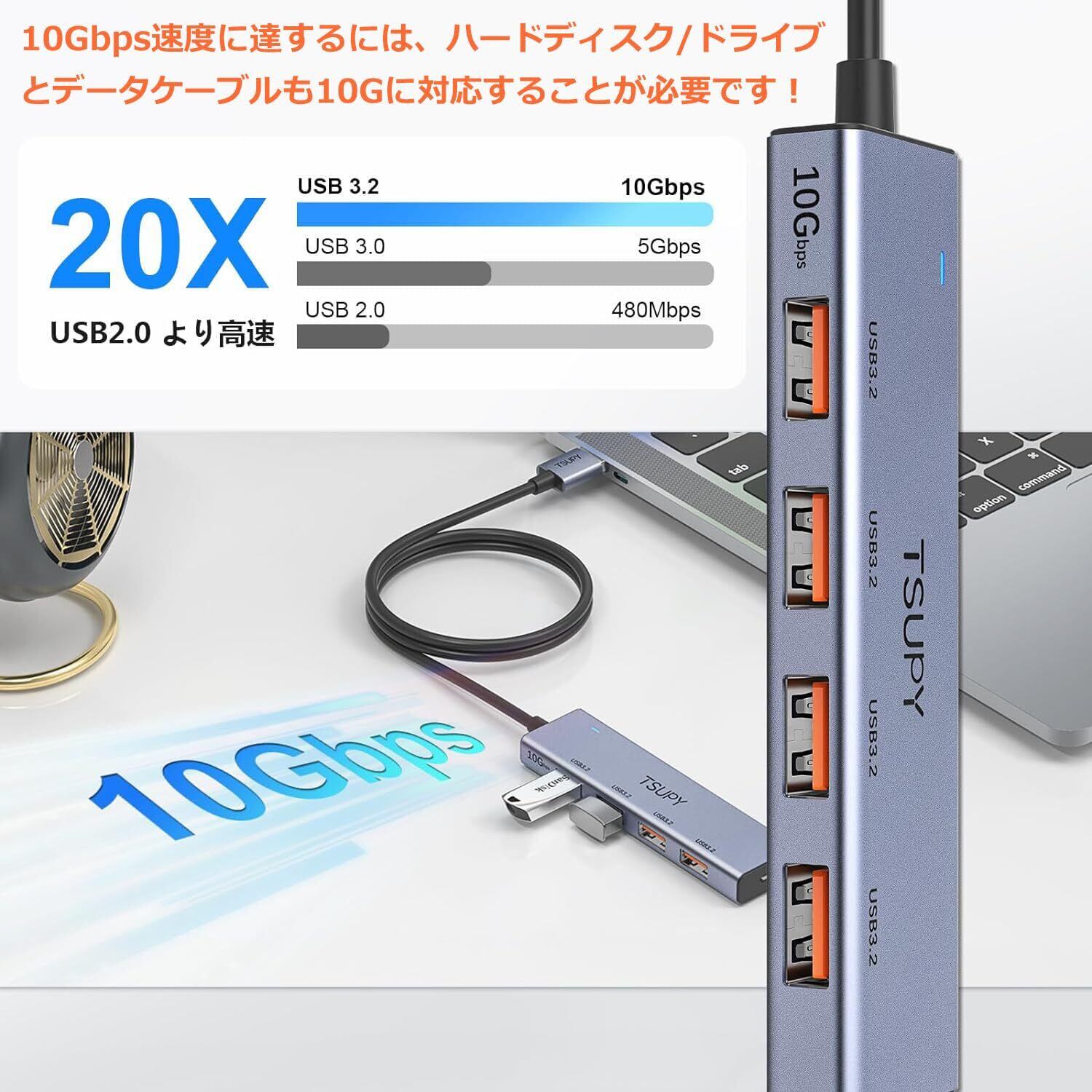 【10Gbps超高速データ転送】2024アップグレード版。最大10Gbps高速転送速度に達ちUSB HUB、従来のUSB 2.0より20倍速く、 ビデオ/写真/その他の大容量ファイルも素早く転送でき、作業効率が向上します。USB 3.1/3.2 Gen2に対応します。USB 3.2(Gen 1)/3.1(Gen 1)/3.0/ 2.0接続と下位互換性があります。(ご注意:10Gbps速度に達するには、ハードディスク/ドライブとデータケーブルも10Gに対応していなければならない。)