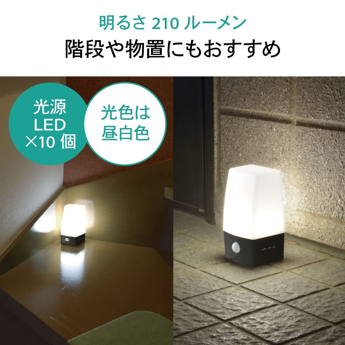 【 仕 様 】 ◆光源:LED×10個/昼白色 ◆人感センサー検知範囲:正面約5m、左右約90°、上下約90° ◆全光束:約210ルーメン ◆点灯保持時間:約10秒 ◆切替スイッチ:AUTO・OFF・ON ◆外形寸法:(約)幅83×高さ147×奥行76mm ◆質量:約172g(乾電池除く) ◆電源:単3形乾電池×6本(乾電池別売)
