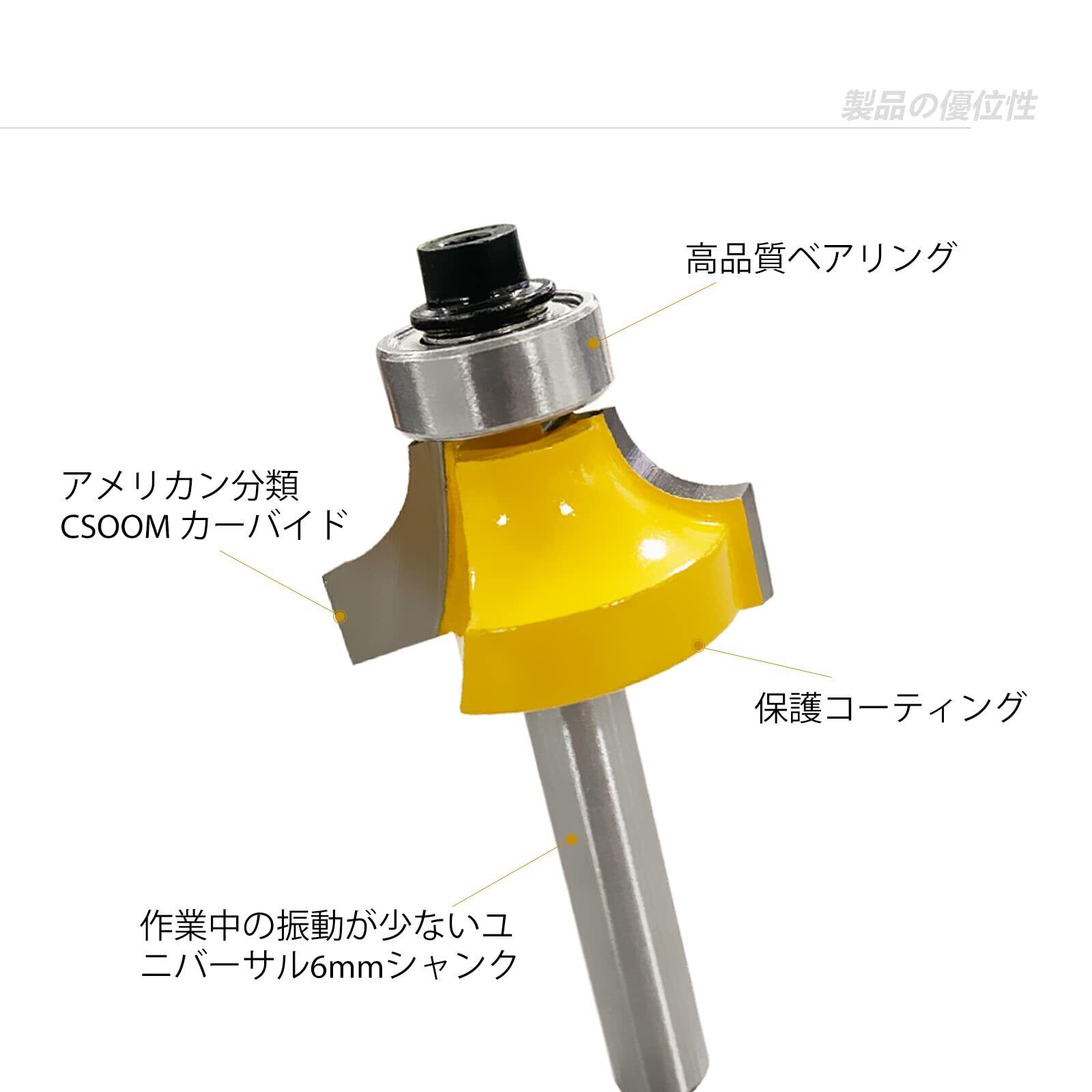 色はイエローで、シャンク径は6㎜、形状は面取りビットです。刃部にはHS2合金を採用し、表面には塗装が施されており、切断速度と耐摩耗性に優れています。使用にはベアリングやガイドベアリングが付属しています。精密に研磨された鋭い先端性能により、より高い安定性を提供し、振動を最小限に抑えます。