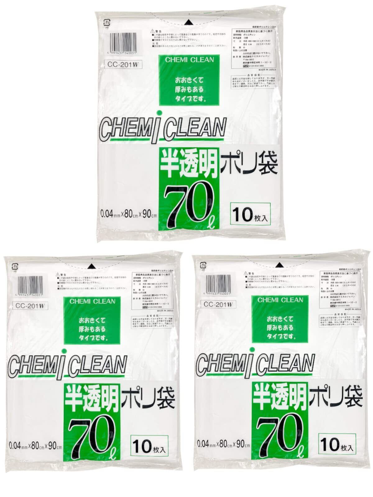 ケミカルジャパン ゴミ袋 厚くて丈夫 ポリ袋 CC-201W 70L 半透明 30枚 (10枚×3セット) 幅80×高さ90cm 厚み0.04mm