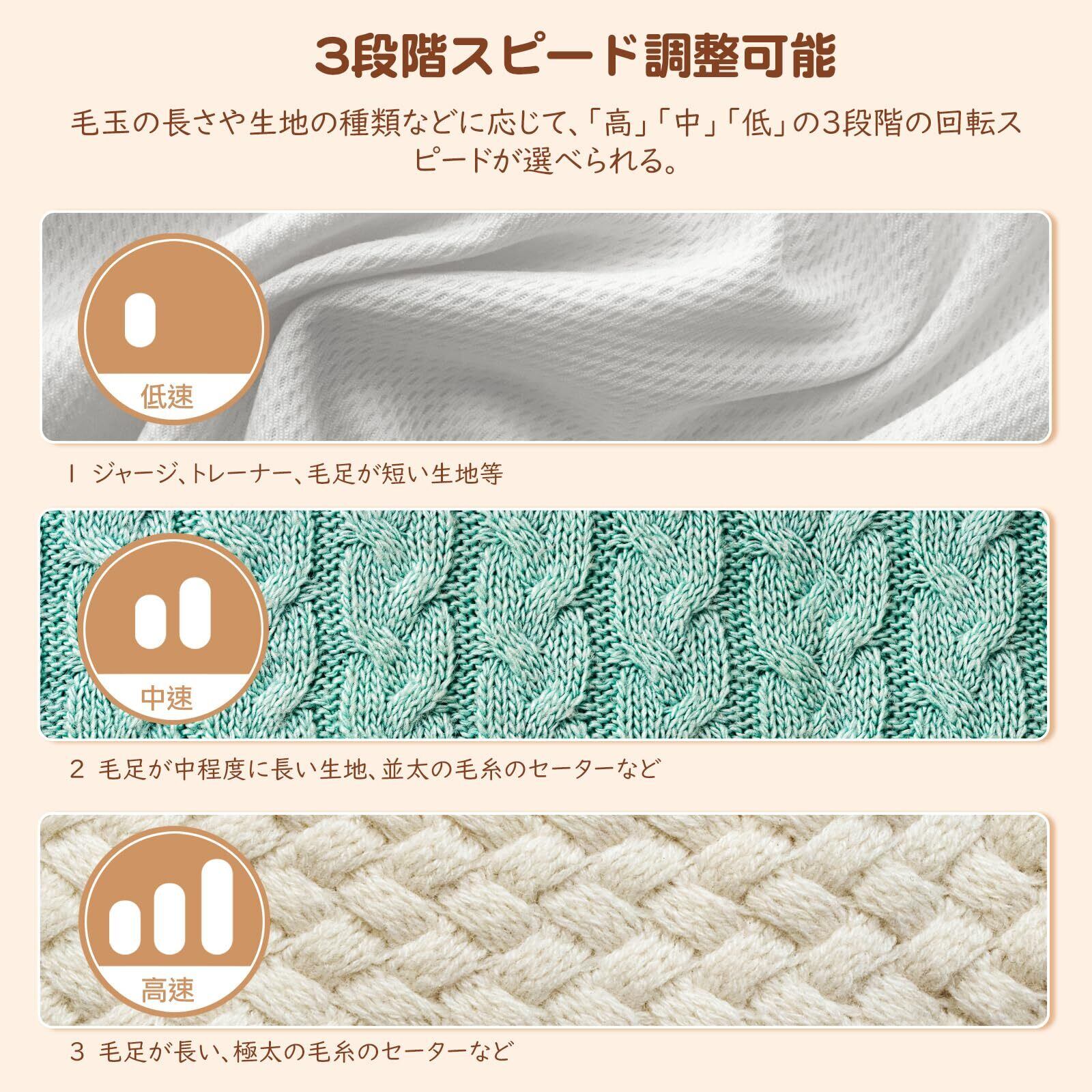 「3段階スピード調節」 極めてシンプルなデザインで、ワンボタンで全ての機能が実現できます。短く一回ボタンを押せば電源オンになり、一番弱いモードで動作します。電源ボタンを押すたびにモードが切り替わり、第4回目は電源オフになります。生地の種類、毛玉のひどさなどにより、必要に応じてモードを選びます。ご注意:誤作動を防ぐために、ボタンを長押しする場合は通電しない仕組みになっています。