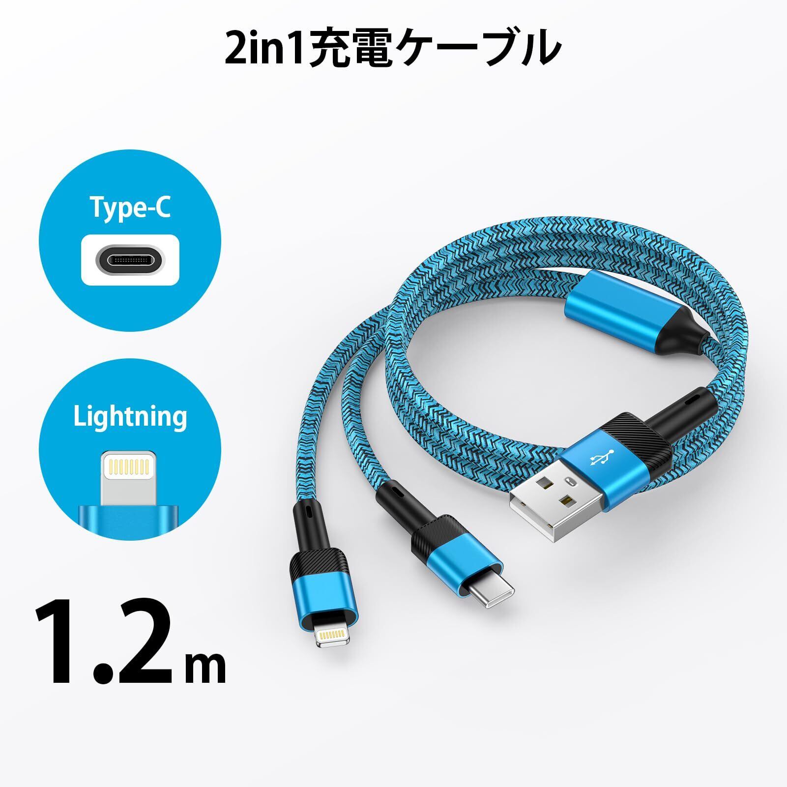 iPhone 充電ケーブル 1.2m 2in1 充電ケーブル2.4A&3A 急速充電 USB-A to USB-C & Lightning ケーブル ライトニングケーブル Type-c アイフォン usb 充電コード 高耐久ナイロン編み 2台同時充電対応 iPhone 16/15/14/13/ Pad/USB-C機器対応 ブルー