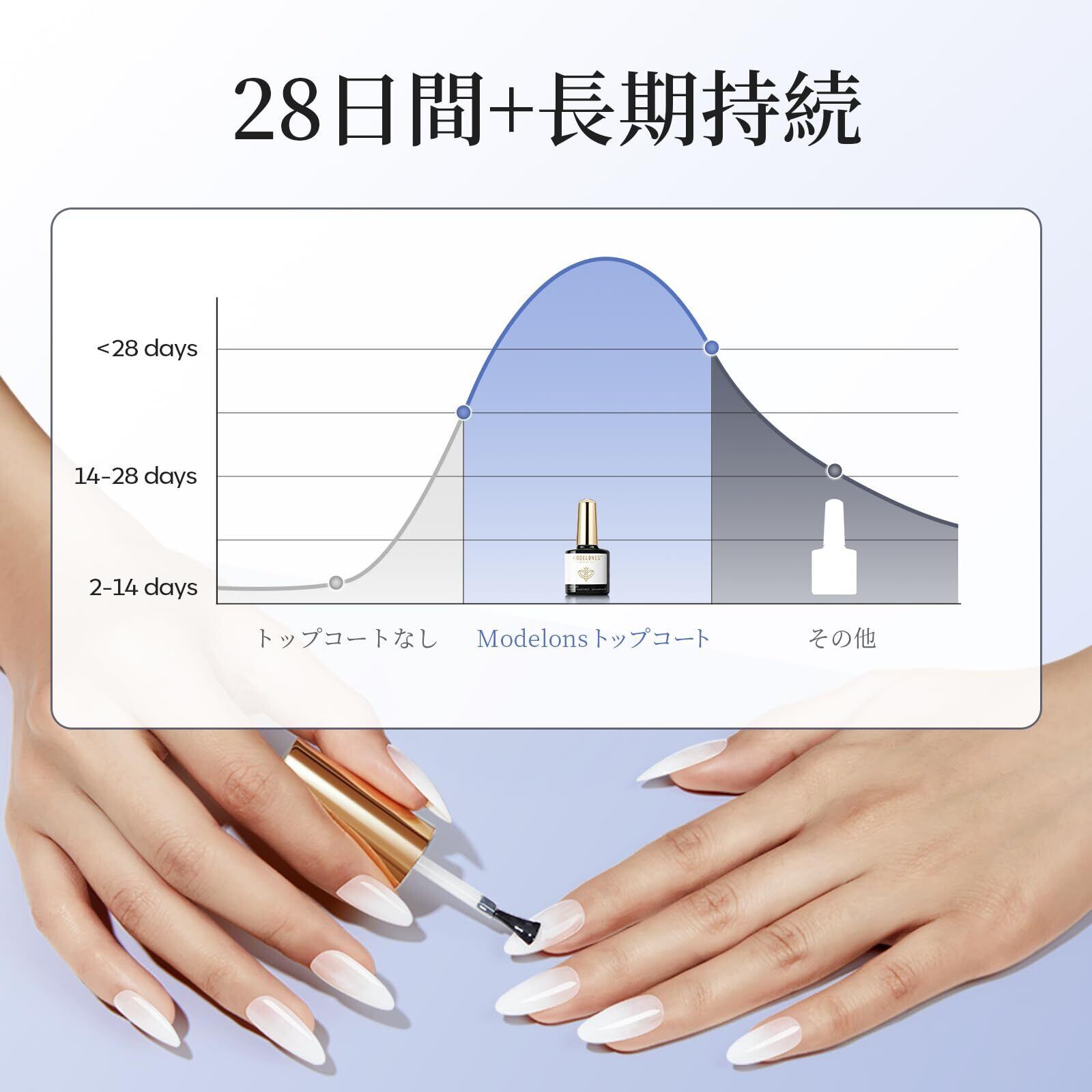 トップジェル:硬化後のベタベタした未硬化ジェルが出ないから、硬化後の拭き取り不要。拭き取りで曇ることや、ふき取りの際にワイプでの表面を傷つけることもなく硬化だけで美しいネイルが完成。拭き取り不要のこのノンワイプトップジェルはテクスチャーも一般の方、プロの方も満足間違いなし。28日以上の長持ち