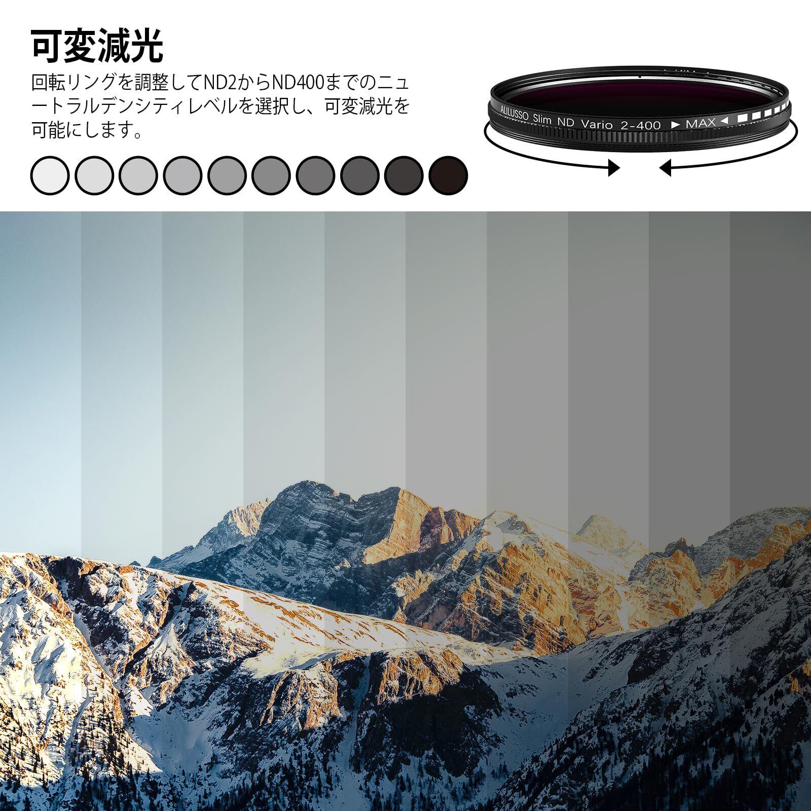 【52MM 可変NDフィルター】自分のニーズに合わせて、減光調整可能で、カメラに取り込む光量をコントロールすることができ、カメラの画質にも影響なしで、スマホンで撮影をより楽しめます。(注意: maxには、一般的に 「Xブラッククロス 」というクロスパターン効果を引き起こす可能性があります。この現象は自然で一時的なもので、調整可能なNDフィルターと特定のレンズや焦点距離との相互作用によって発生します)