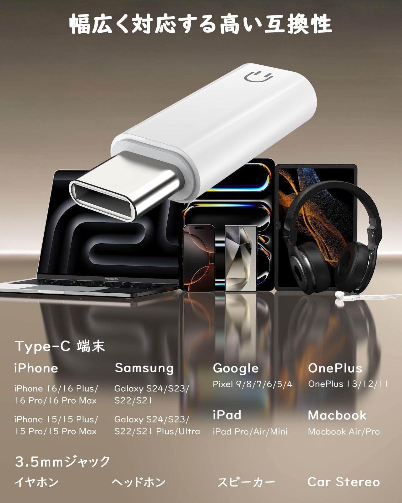 「幅広いデバイスに対応する高い互換性」本アダプターは、USB-Cポートを備えたさまざまな端末に対応できております。iPhone 16/16e/15シリーズやiPad Pro/Air、Galaxy SシリーズなどUSB-C端子を搭載した多くのスマートフォン、タブレット、ノートパソコンに対応可能です。音楽の再生、動画視聴、通話など幅広い使用シーンで活躍します。