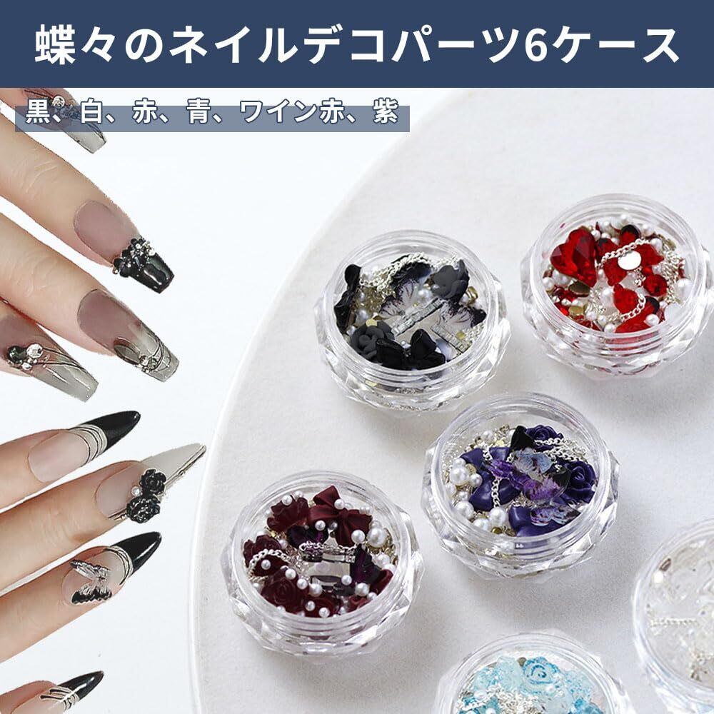 【バタフライネイルデコセット6ケース】ブラック、ホワイト、レッド、ブルー、ワインレッド、パープル。カラーバリエーションが豊富なバタフライモチーフ。
