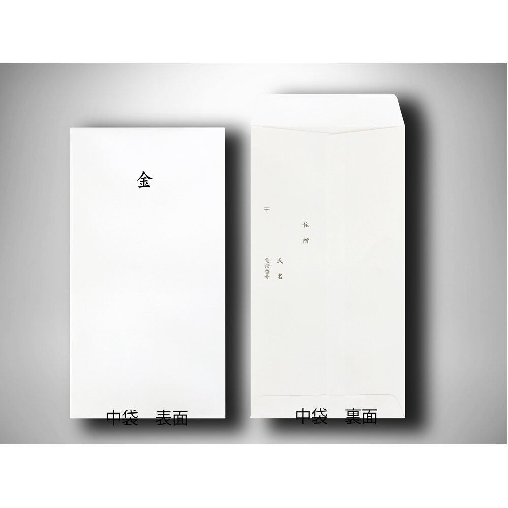中袋の書き方一例としましては縦書きで表面に金額(金○千円)、裏面に住所・氏名等を記入。
