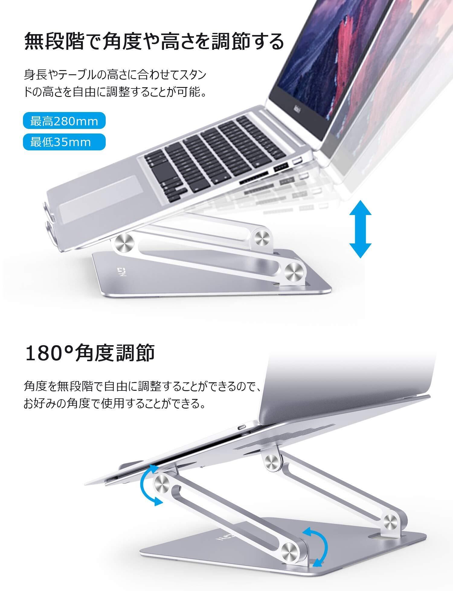 ●【角度・高さを自由に調節出来る】:ノートPCスタンドの角度は無段階に調整でき、高さは約35mm~280mmの範囲で調節可能です。画面を目線の高さに合わせることで、自然と姿勢がましになり、肩こりや猫背、腰痛の解消にも効果的。動画視聴など、観る系の作業と相性も抜群です。人間工学設計に基づき快適な作業環境を作り上げるノートPCスタンドです。 ●【持ち運びや収納にも便利】:折りたたみ式でコンパクトにまとめることができるので外出先へ持ち運ぶことや、カバンへの収納も綺麗に行えます。