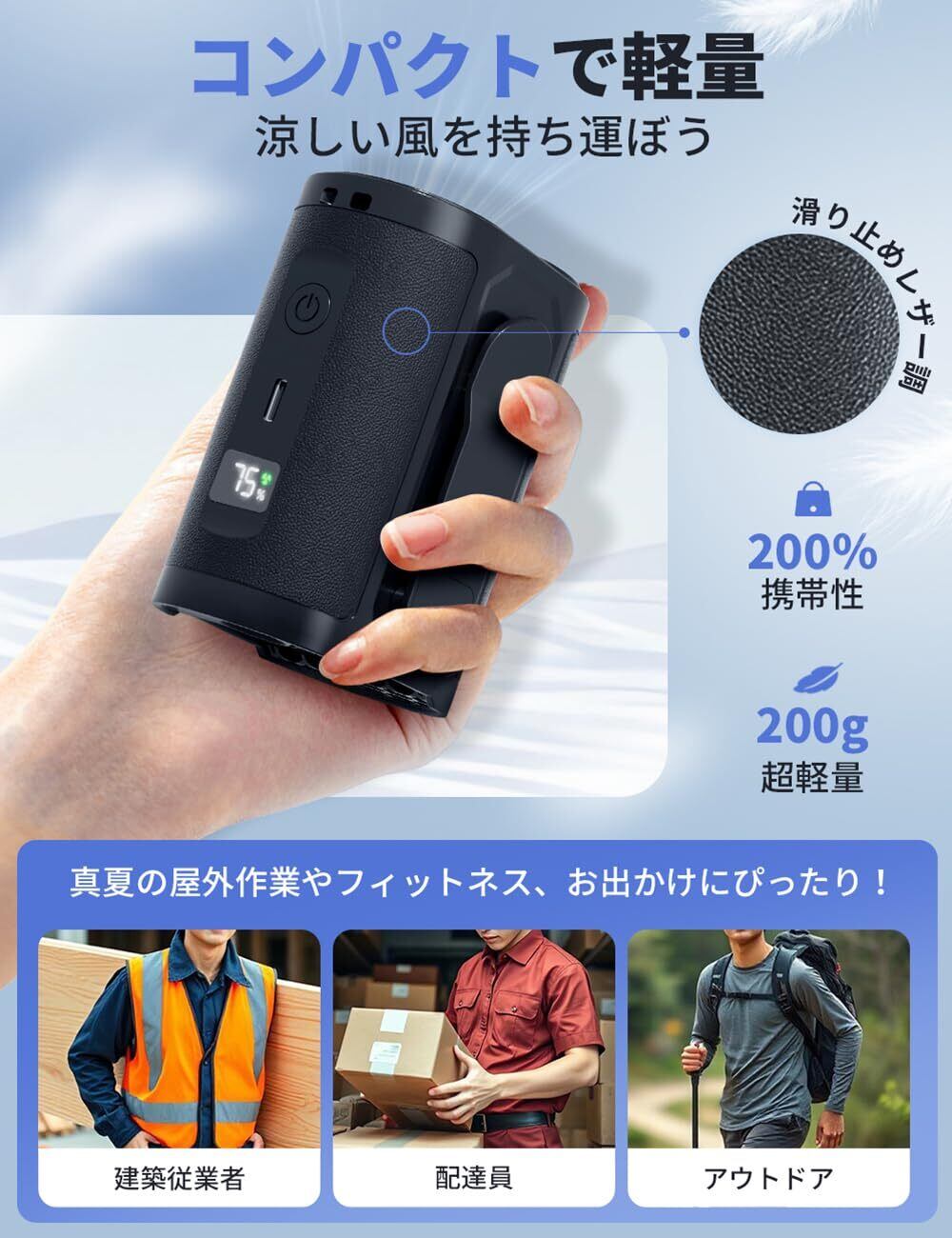 【小型・超軽量】ウエスト扇風機本体わずか約200gの軽さで、ウエストや首に取り付けても負担にならず、快適にお使いいただけます。手のひらサイズのコンパクト設計で、外出時や屋外作業にもぴったり。暑い日でも快適に過ごせます!