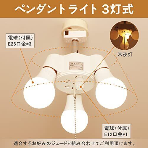 ペンダントライト 3灯 60cm超長いチェーン付き E26 LED電球付き 引掛けシーリング用 天井照明 ソケット 【E26 LED電球 60W形 電球色*3+E12 常夜灯 電球色*1】