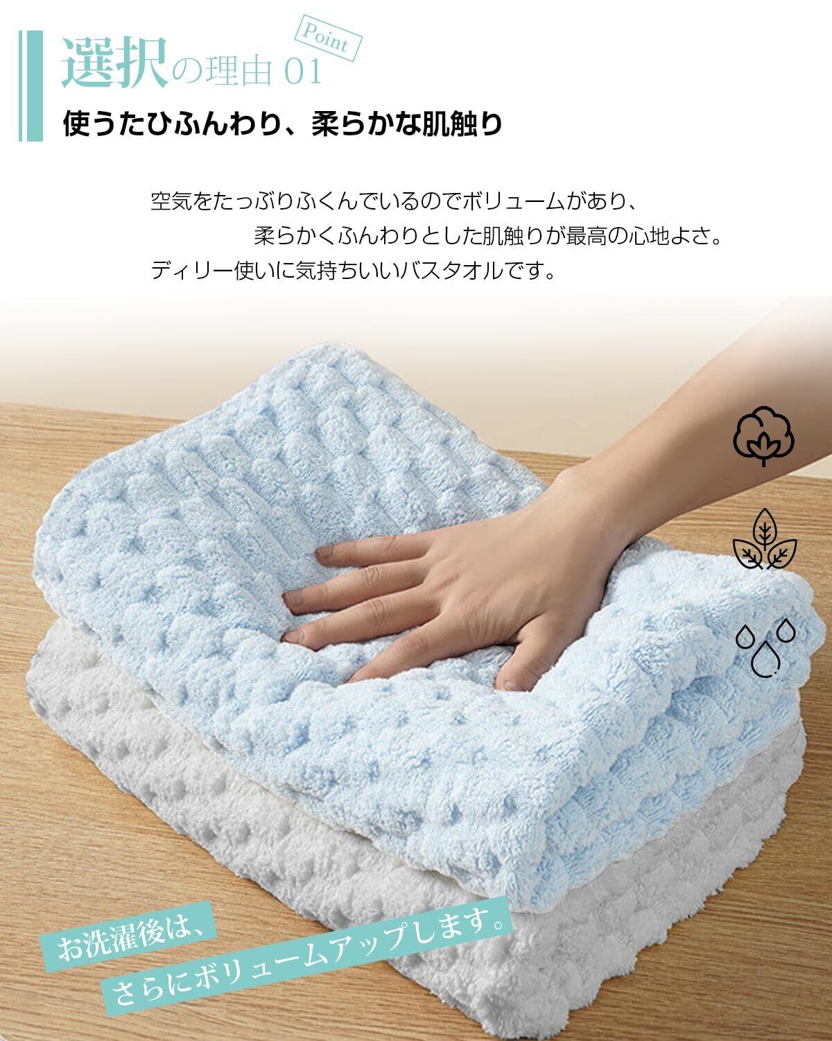 「抜群の吸水性·優れた速乾性」非常に細かい繊維からできている為、優れた吸水性を発揮します。さらに通気性が良いため、水分を素早く乾かします。入浴後の水分をサッと吸収する抜群の吸水力です。さらりとした快適な使い心地です。湿気によるカビや細菌の繁殖を抑えます。梅雨の場合や湿気が多い季節でも、乾き早くていつも清潔を保ちます。洗濯物を乾きにくい時期にも快適で使えます。室内で干しても大丈夫です。