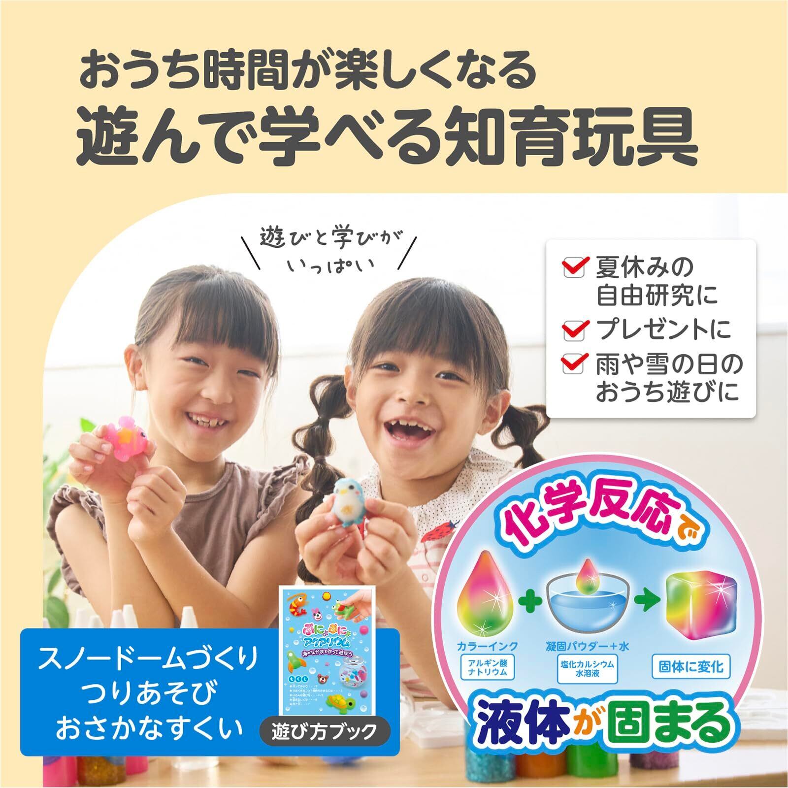 水槽に入れてオリジナルのアクアリウムが作れる。お風呂やプールでも一緒に遊べる。自由研究や夏休み工作にもピッタリ。