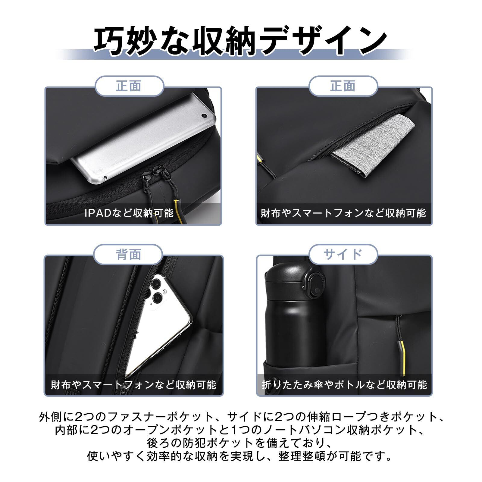 巧妙な収納デザイン: 外側に2つのファスナーポケット、サイドに2つの伸縮ロープつきポケット、内部に2つのオープンポケットと1つのノートパソコン収納ポケット、後ろの防犯ポケットを備えており、使いやすく効率的な収納を実現し、整理整頓が可能です。
