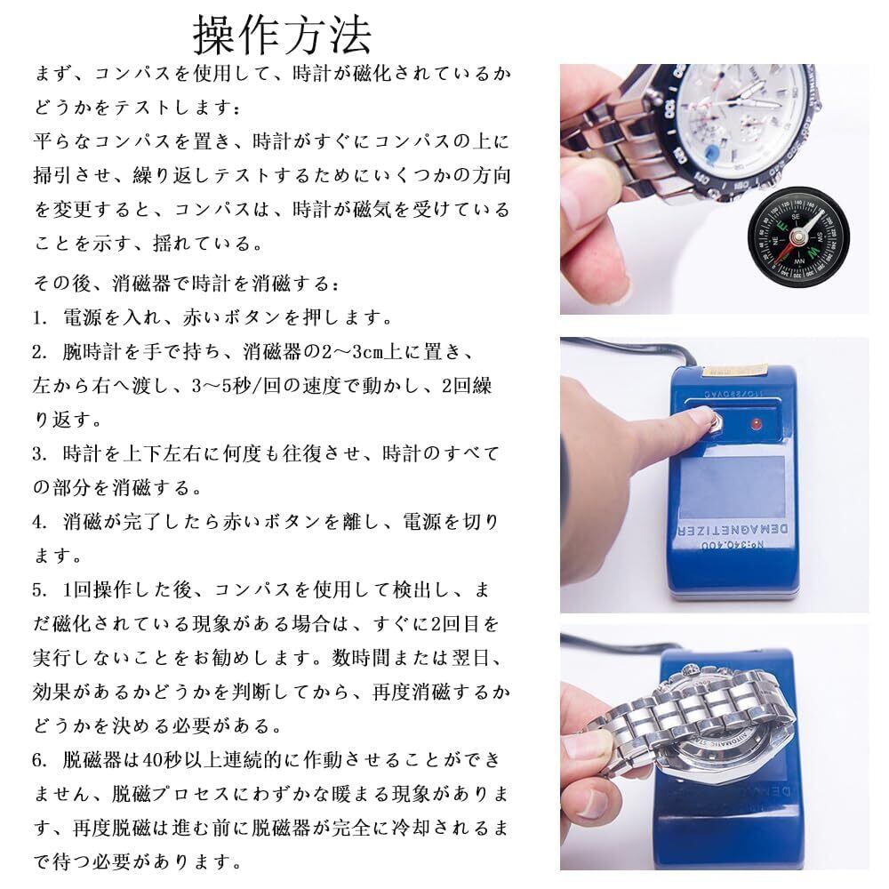 3. 使用方法:時計を消磁エリアに2cm置き、赤いボタンを押します。同じ方向から少し動いて、磁力が見えなくなるまで、磁気抜きが完成です。磁化した時計や不正確な移動時間を解決するのに適しています。