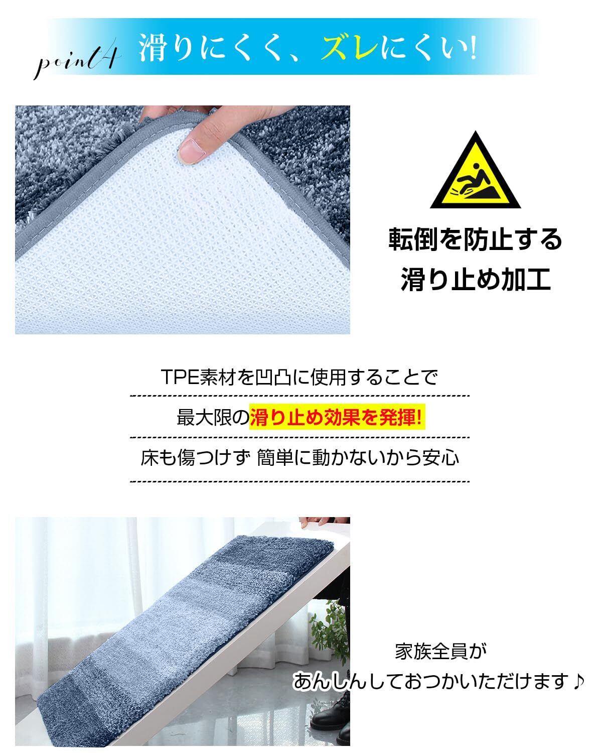 【滑り止め付きで安心】 裏面はTPE素材で、滑り止め加工が施されているのて足を乗せてもズレにくく、使用時にずれる心配がなく、安心してお使いいただけます。それに、しっかりとした丁寜な縫い上げて、毛足が抜けにくく、ポリューム感が持続します 。厚さをしっかりと感じられるバスマットで、踏み心地も抜群で、お風呂上がりも快適です。