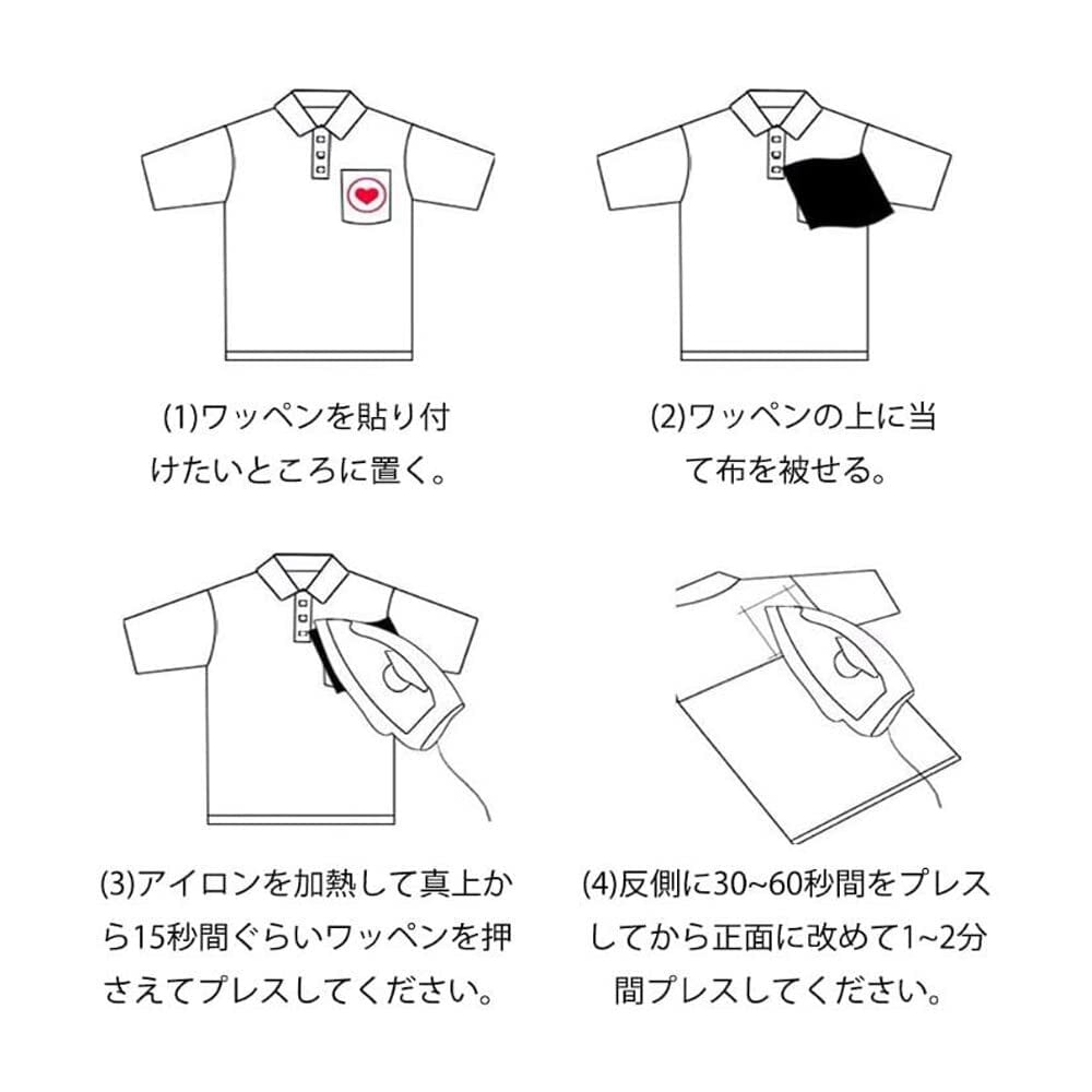 【使用方法】(1)ワッペンを貼り付けたいところに置く。(2)ワッペンの上に当て布を被せる。(3)アイロンを加熱して真上から15秒間ぐらいワッペンを押さえてプレスしてください。(4)反側に30~60秒間をプレスしてから正面に改めて1~2分間プレスしてください。