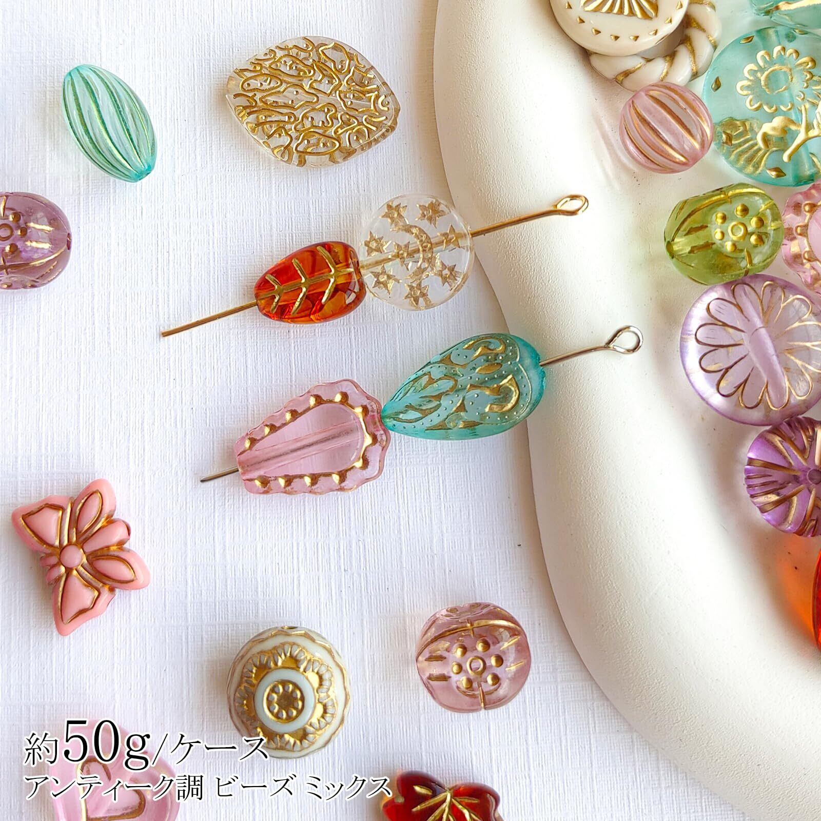 ビーズ アンティーク ミックス 50g入り アクリルビーズ 手芸 ハンドメイド アクセサリー ピアス パーツ チャーム ゴム紐付き(ミックス)