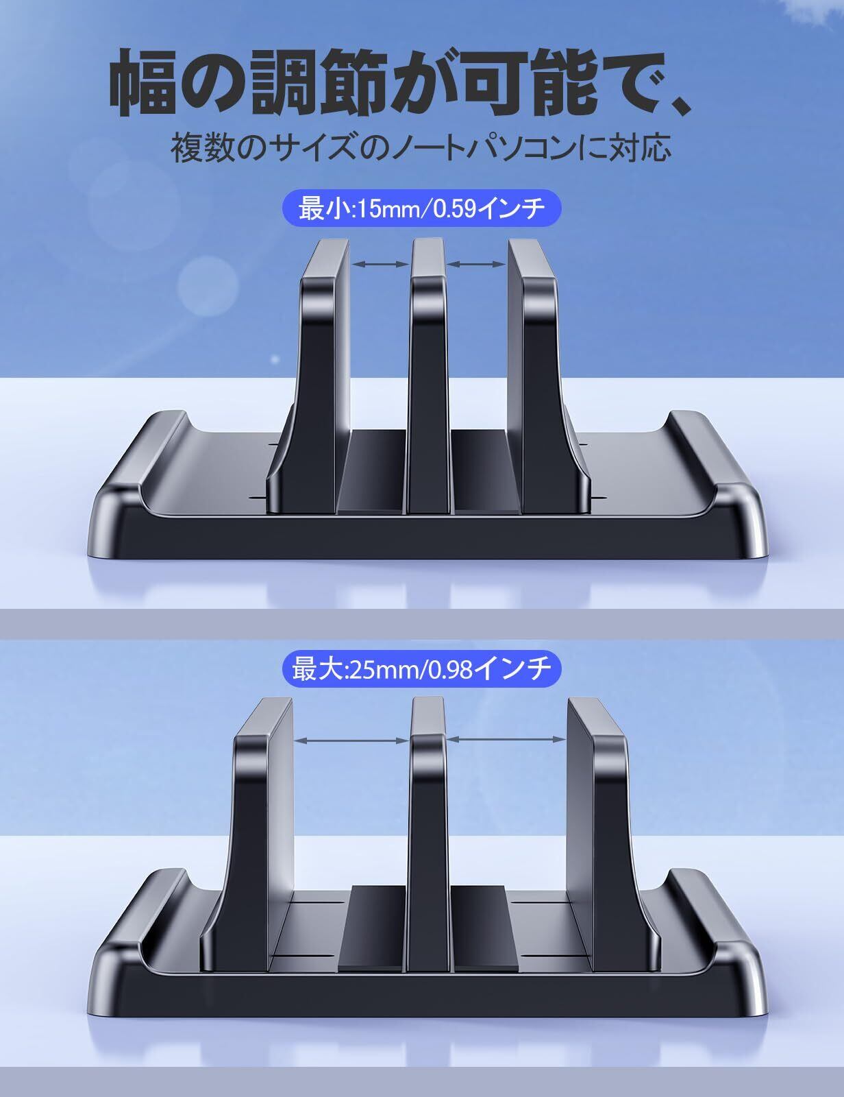 【調整可能な幅】この垂直ノートパソコンスタンドの幅は調整可能で、各種ノートパソコンと互換性があり、各スロット間の厚さは15mmから25mmまでさまざまで、あなたの設備の安全なフィットを確保します!
